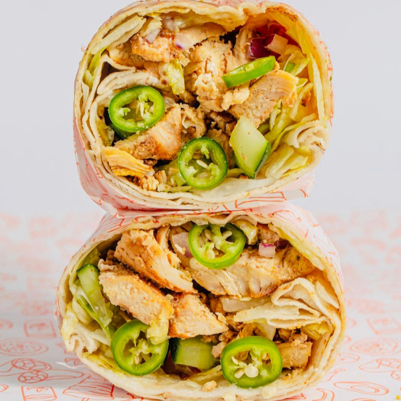 Para los amantes del picante 🌶️ 100gr de proteína a tu elección con lechuga, cebolla, jitomate, pepinillos, pepino, tzatziki, jocoque y chile serrano en pan pita.
