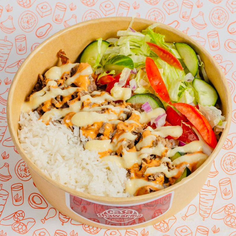 Un bowl perfecto si quieres algo fresco y bien servido: base de arroz basmati, ensalada (lechuga, jitomate, cebolla, pepino y pepinillo) y 120 g de asada estilo shawarma. con gran variedad de salsas, disfruta un plato ligero, completo y lleno de sabor.