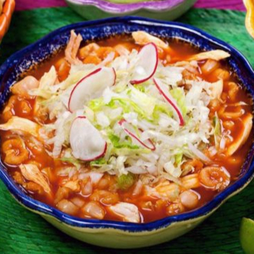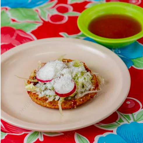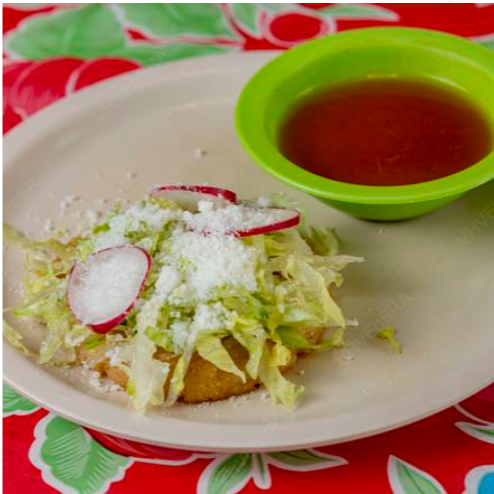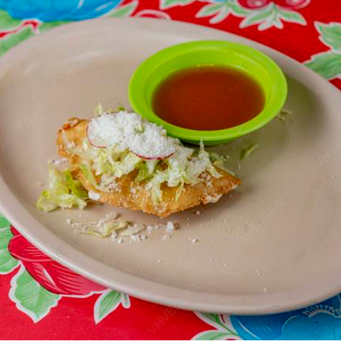 Tortilla de maíz rellena de picadillo, bañadas en salsa y queso.