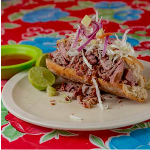 Tortilla de maíz bañadas en salsa roja, rellenas de carne