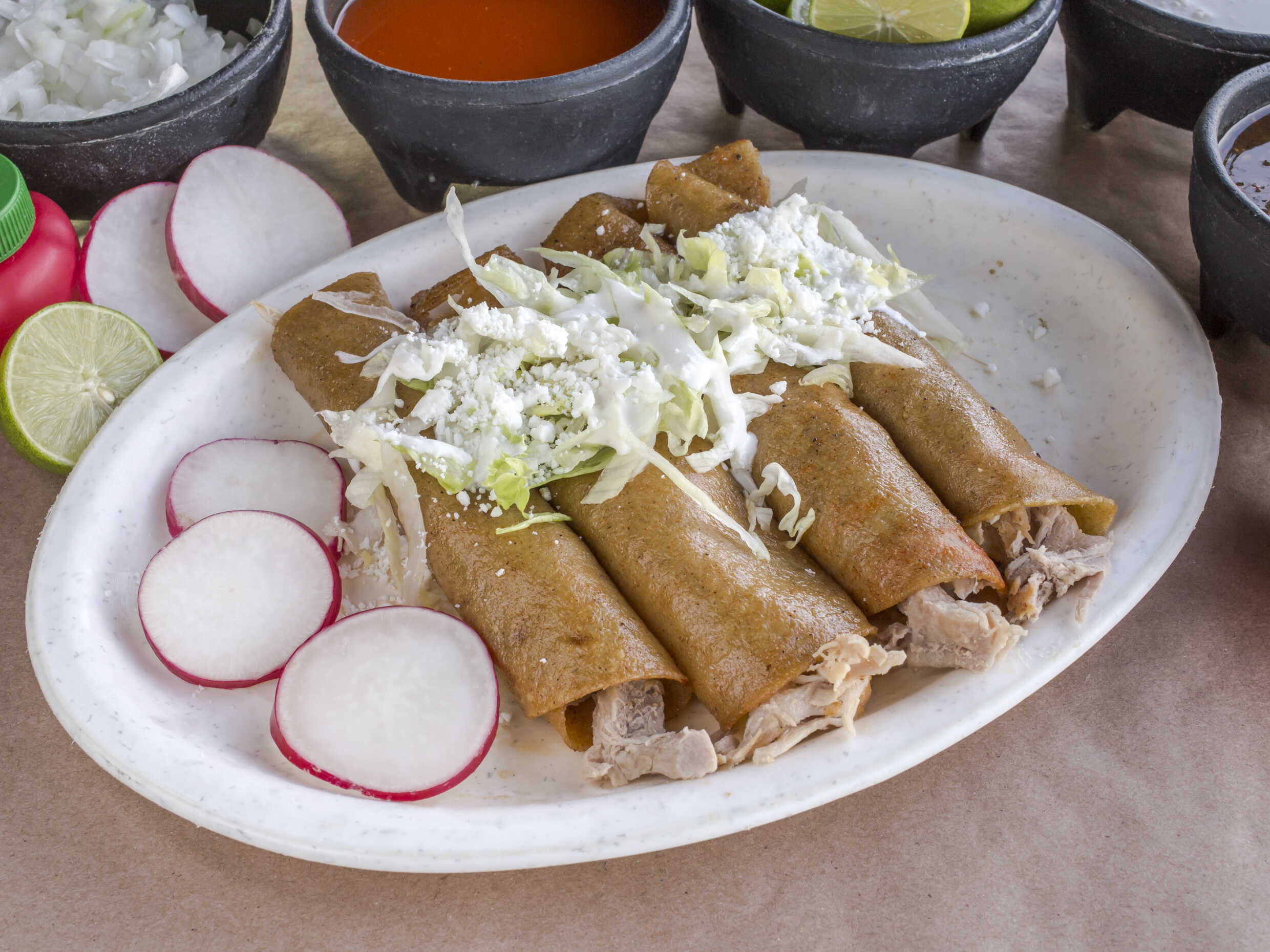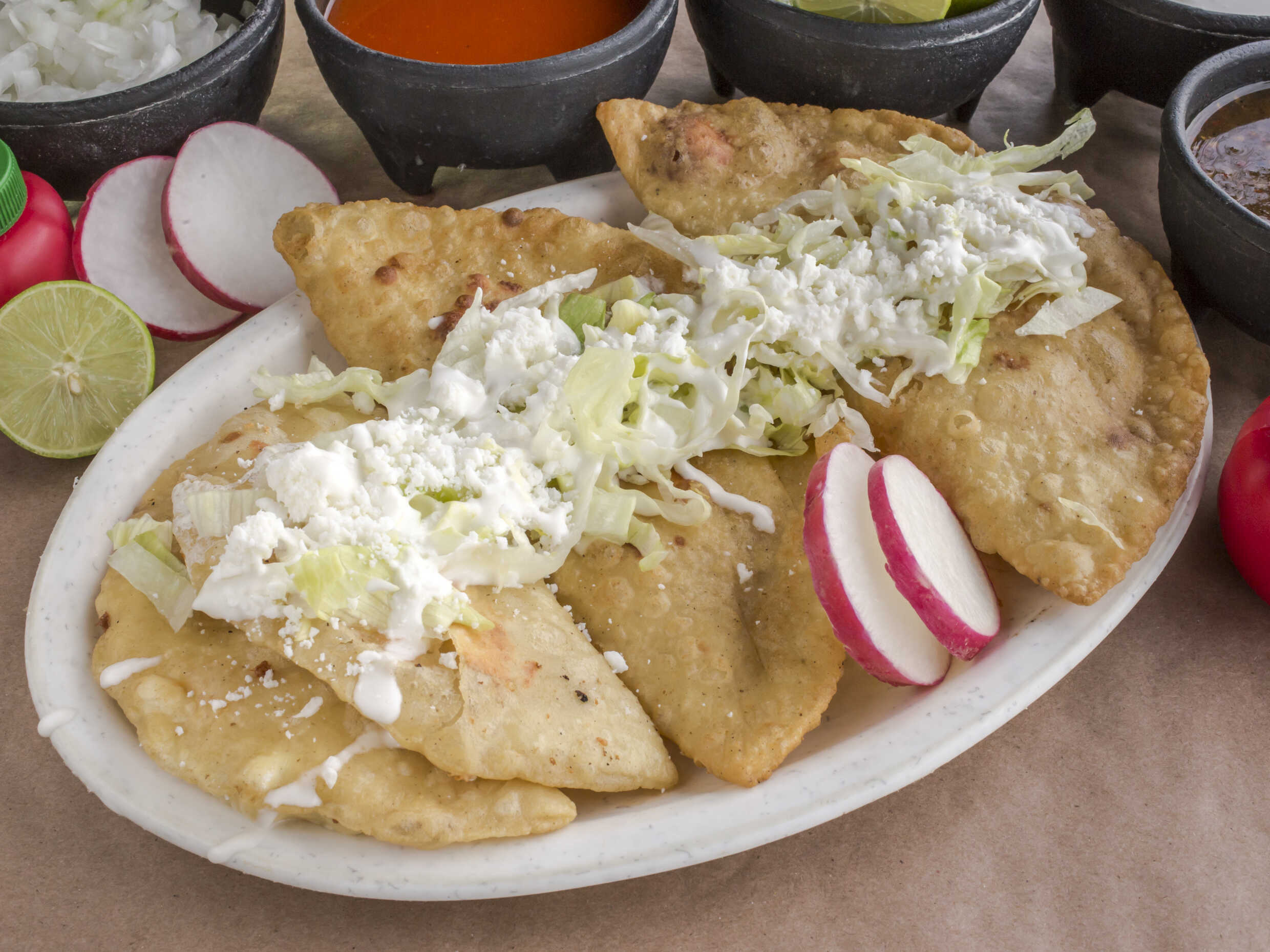 Acompañadas con lechuga salsa cebolla rábano limón y picante.