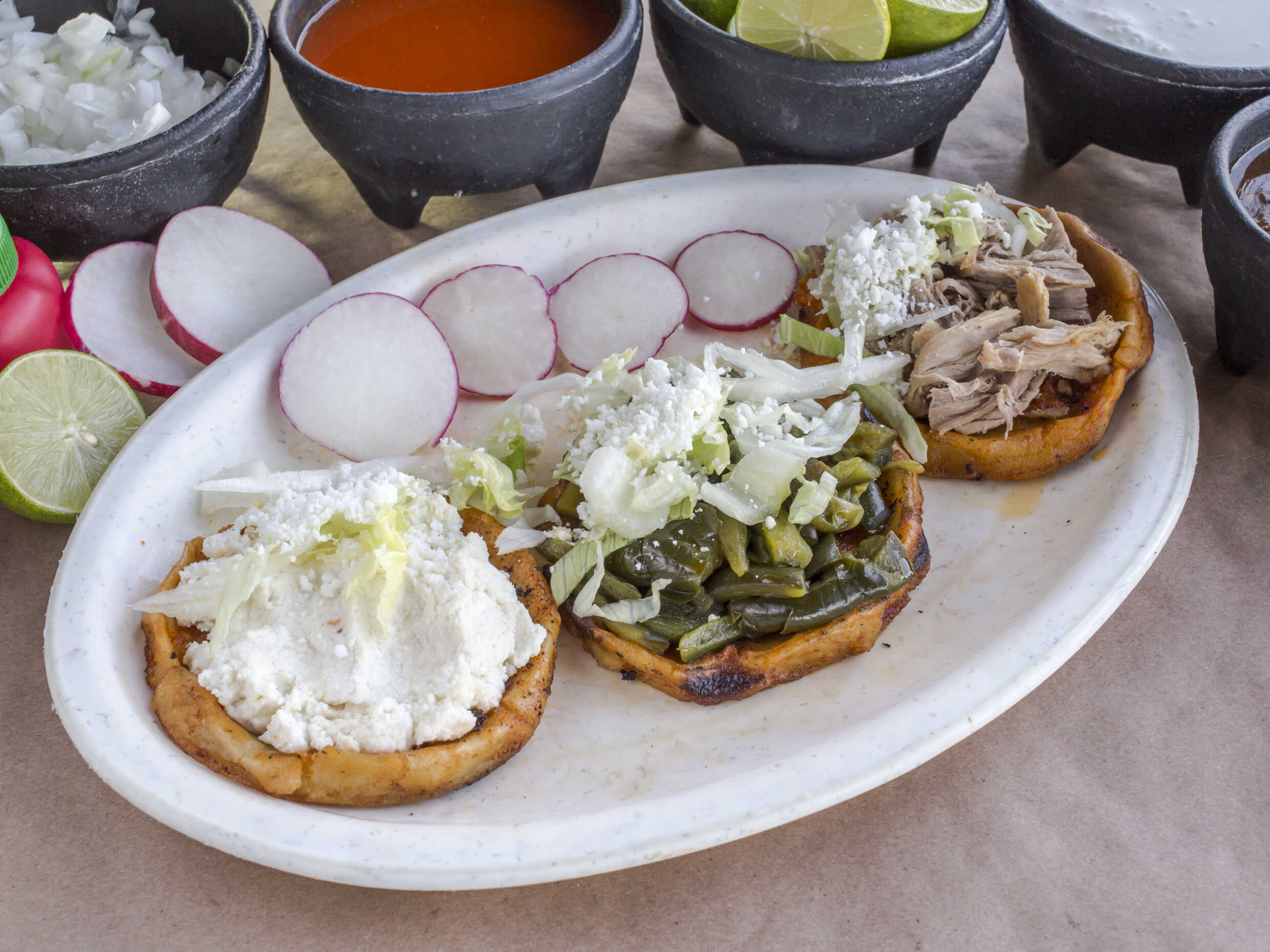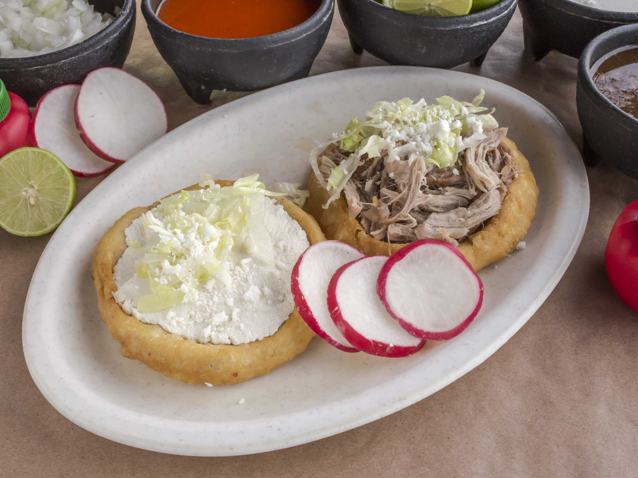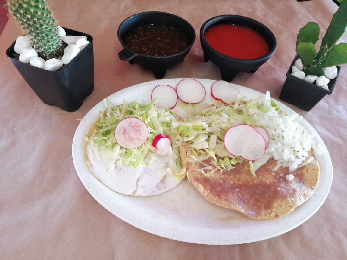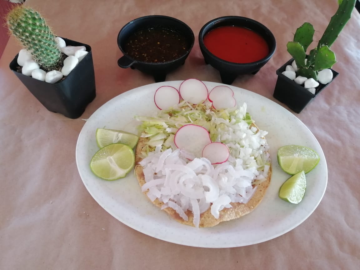 Acompañada con base de frijoles, cebolla, lechuga, rábano, queso espolvoreado, salsa, limón, picante.