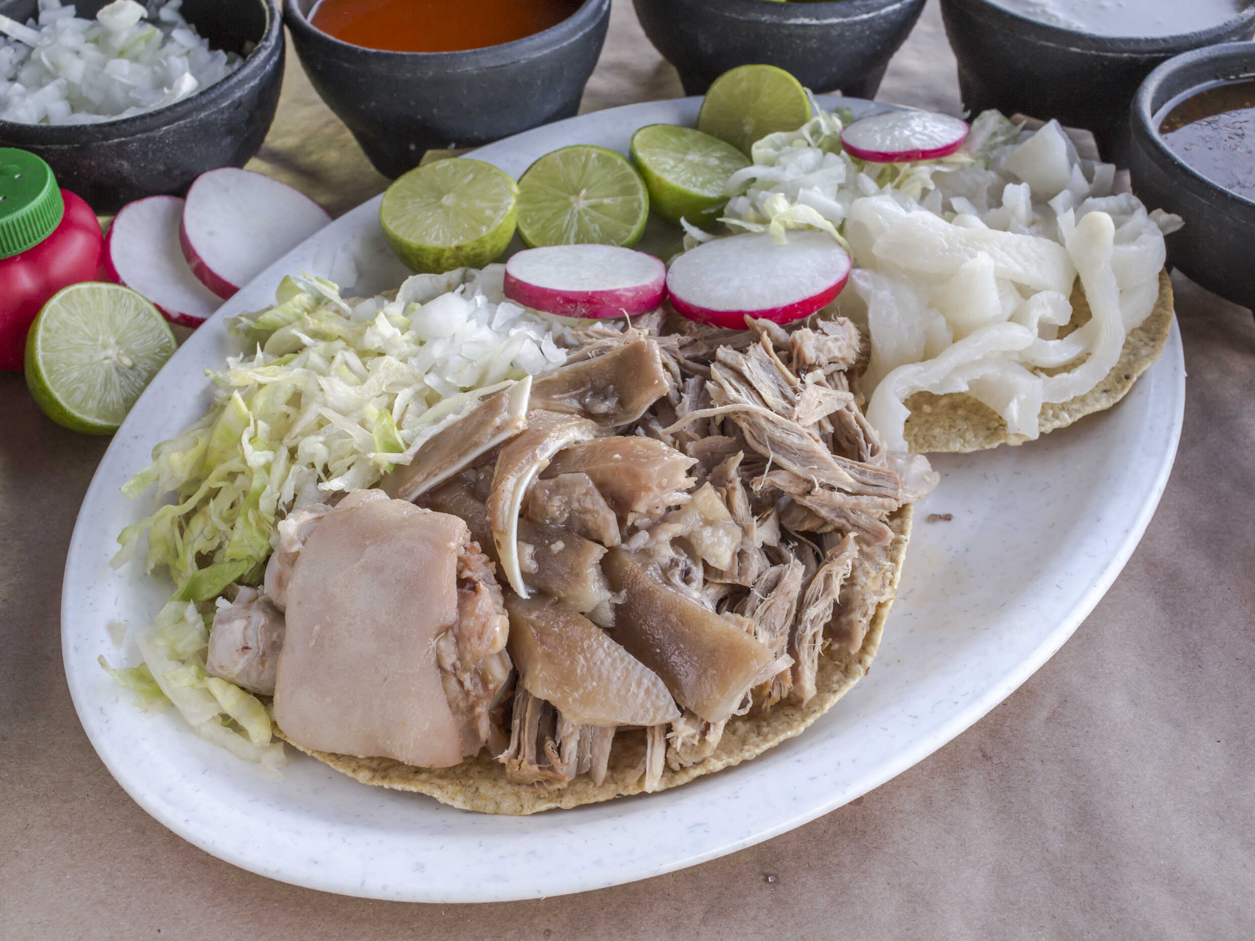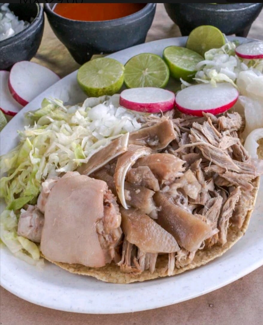 1 Tostada con base de frijoles refritos, acompañada de cueritos suaves y bien sazonados, lechuga fresca, cebolla, rábano en rodajas, queso espolvoreado y salsa. Se sirve con limón y un toque de picante para resaltar todos los sabores.