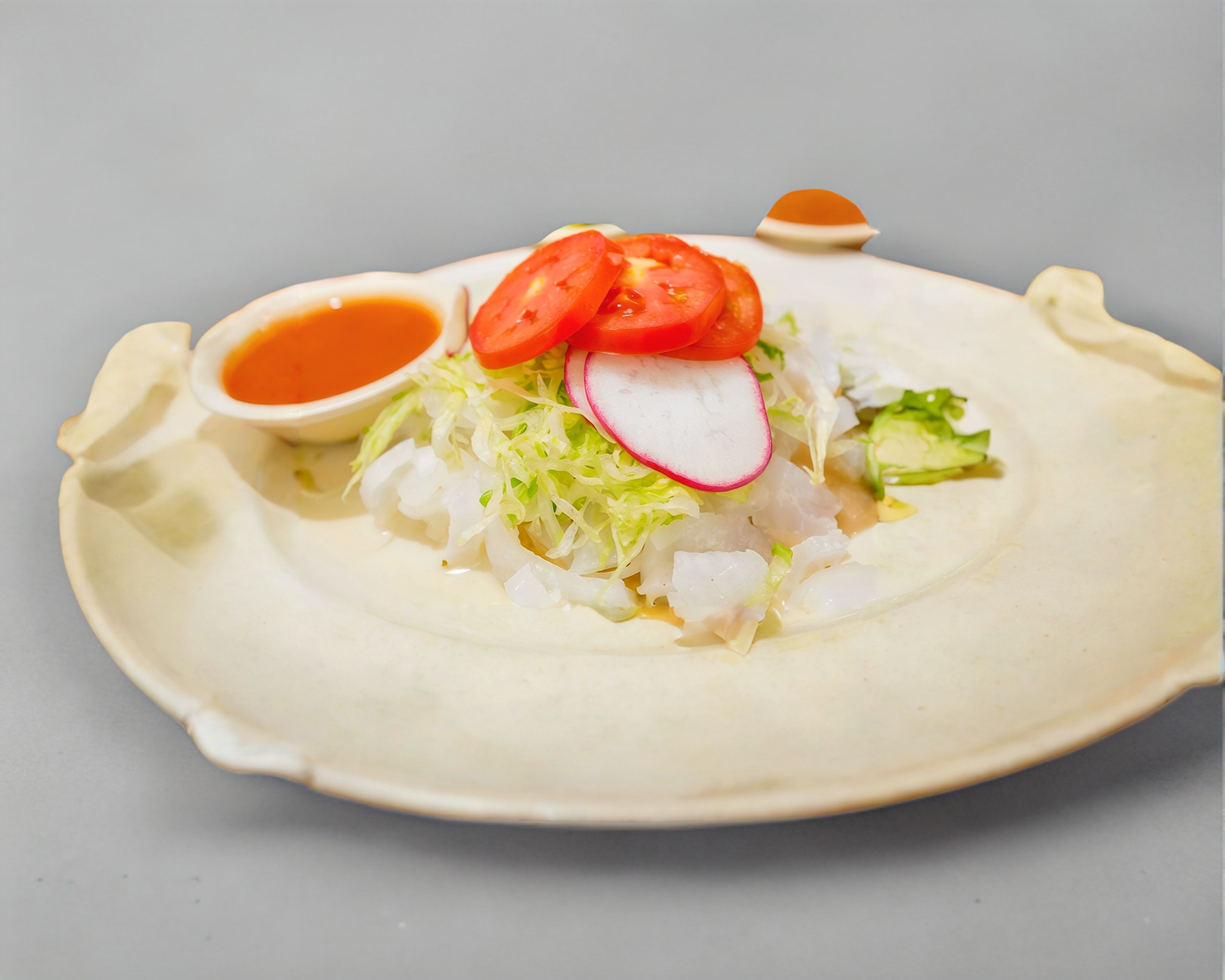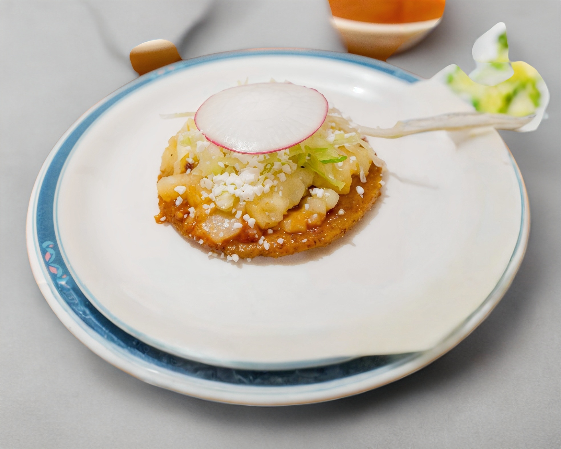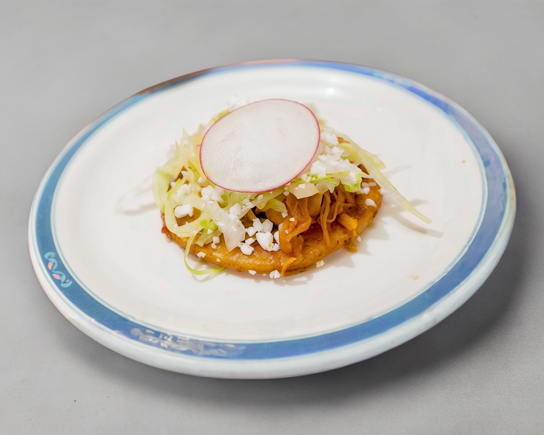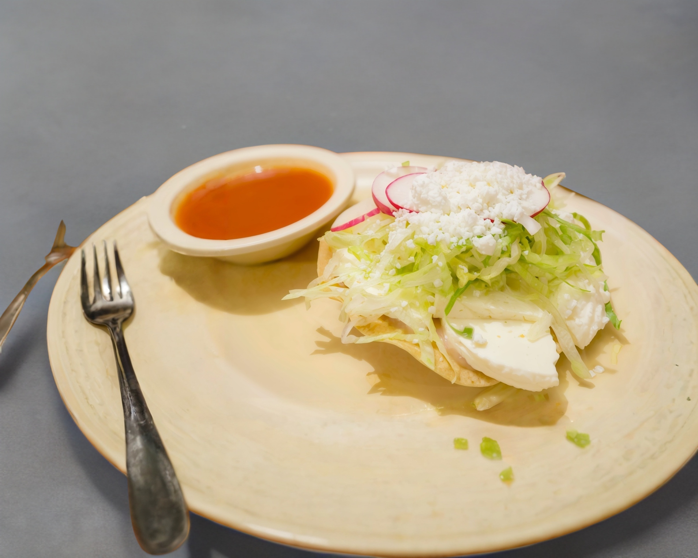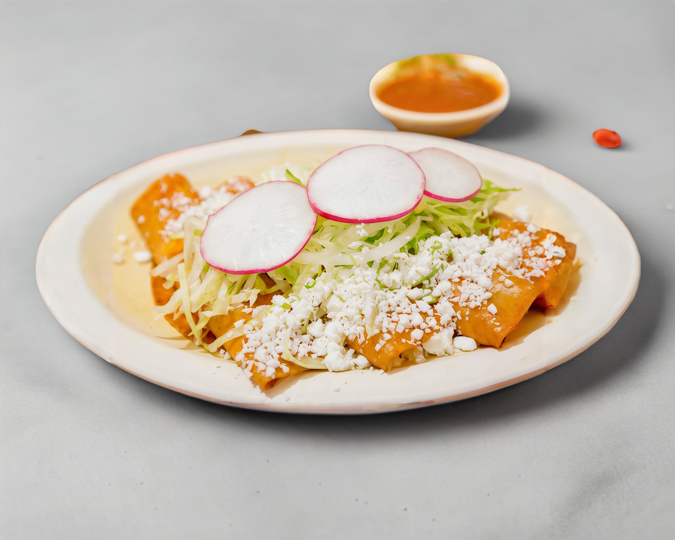 1 Flauta de tortilla raspada con carne, rabano, lechuga, queso, acompañada de salsa picante y de jitomate.