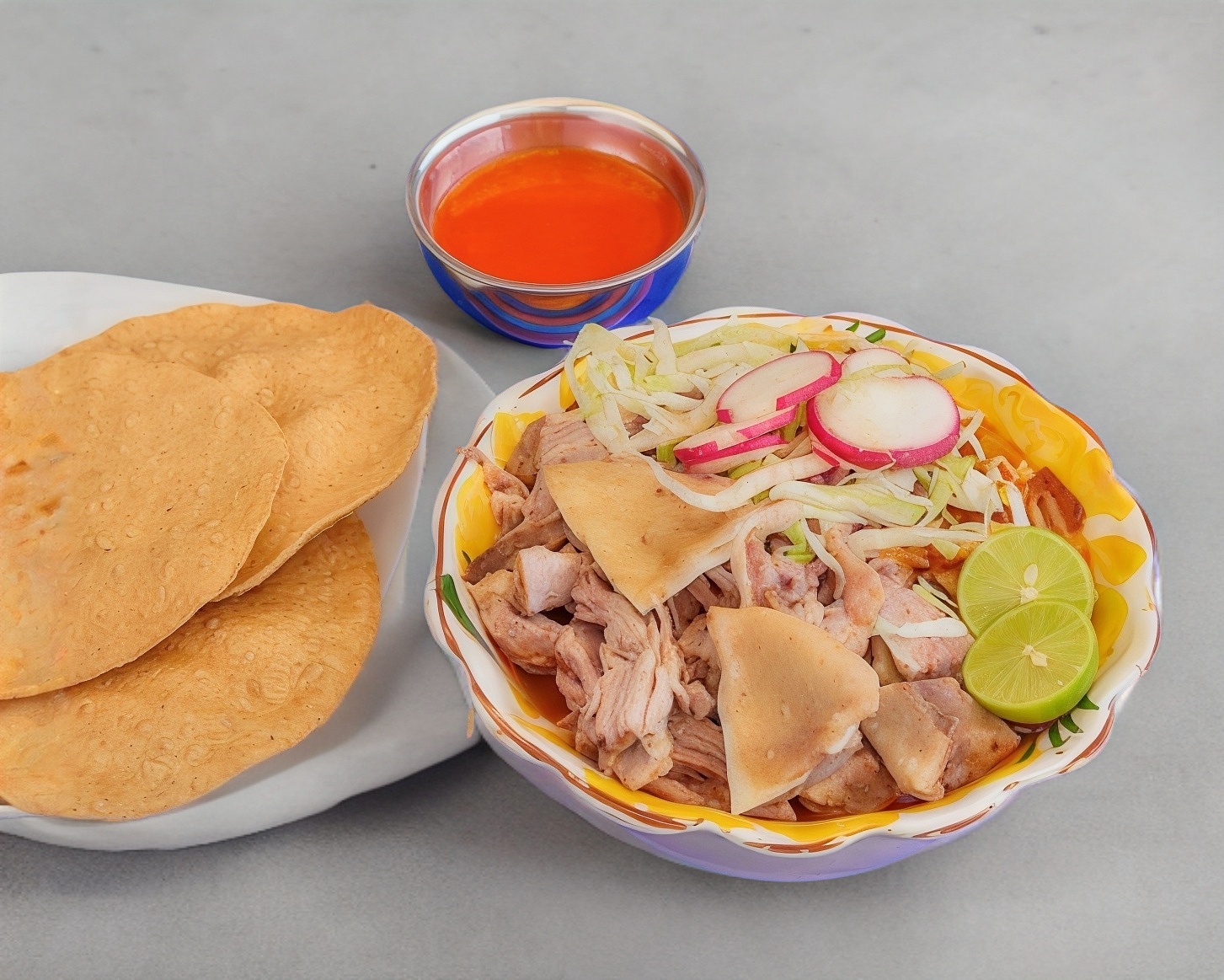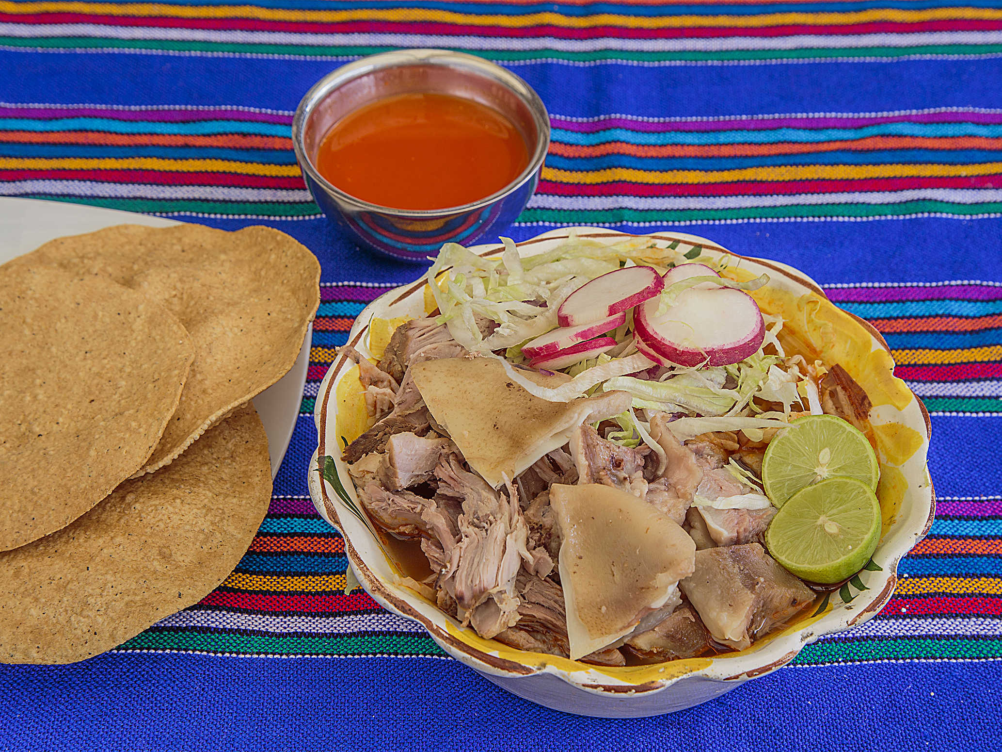 Pozole con carne de puerco acompañado Lechuga; cebolla, Rábanos, Limón, chile, 1 tostadas solas.