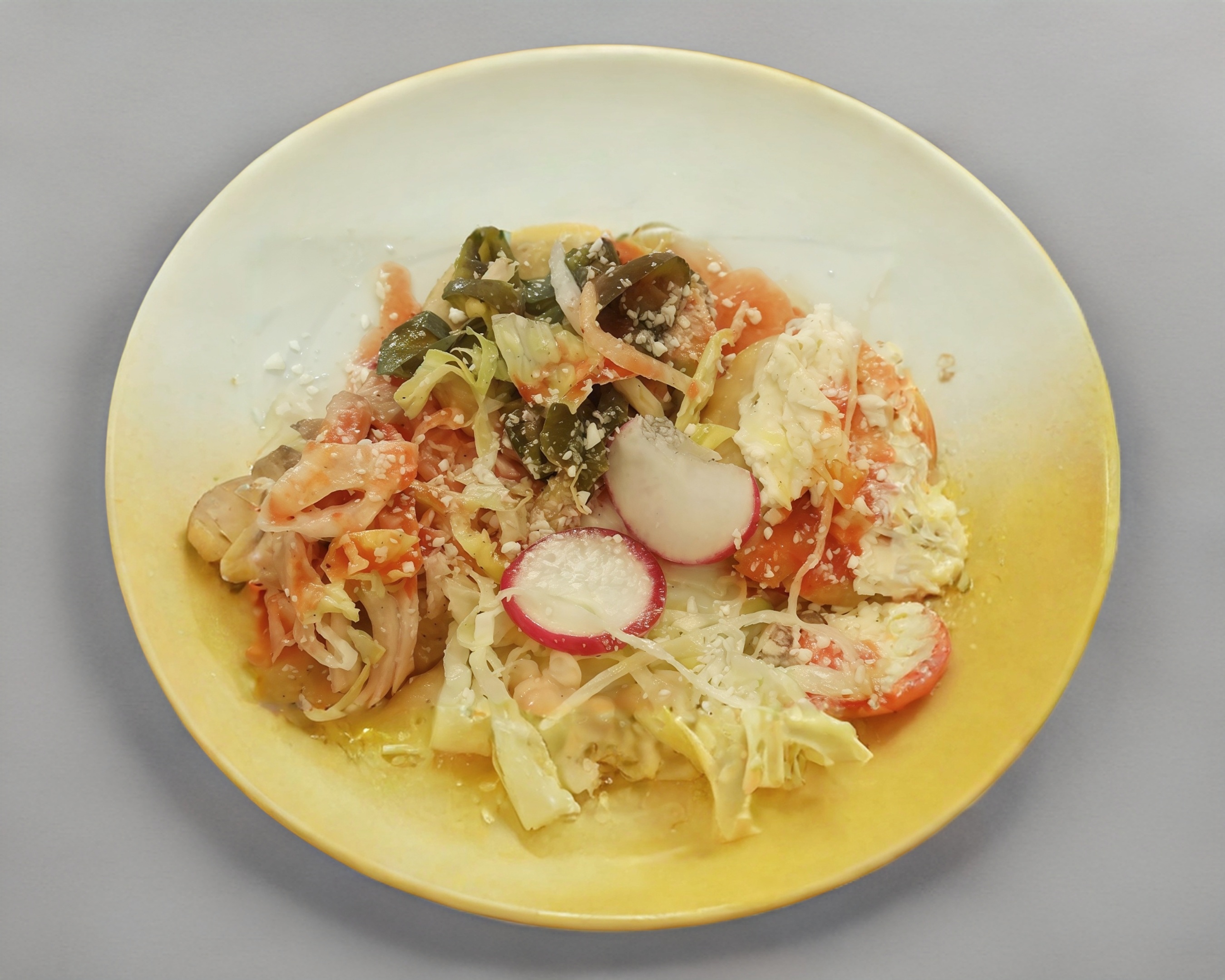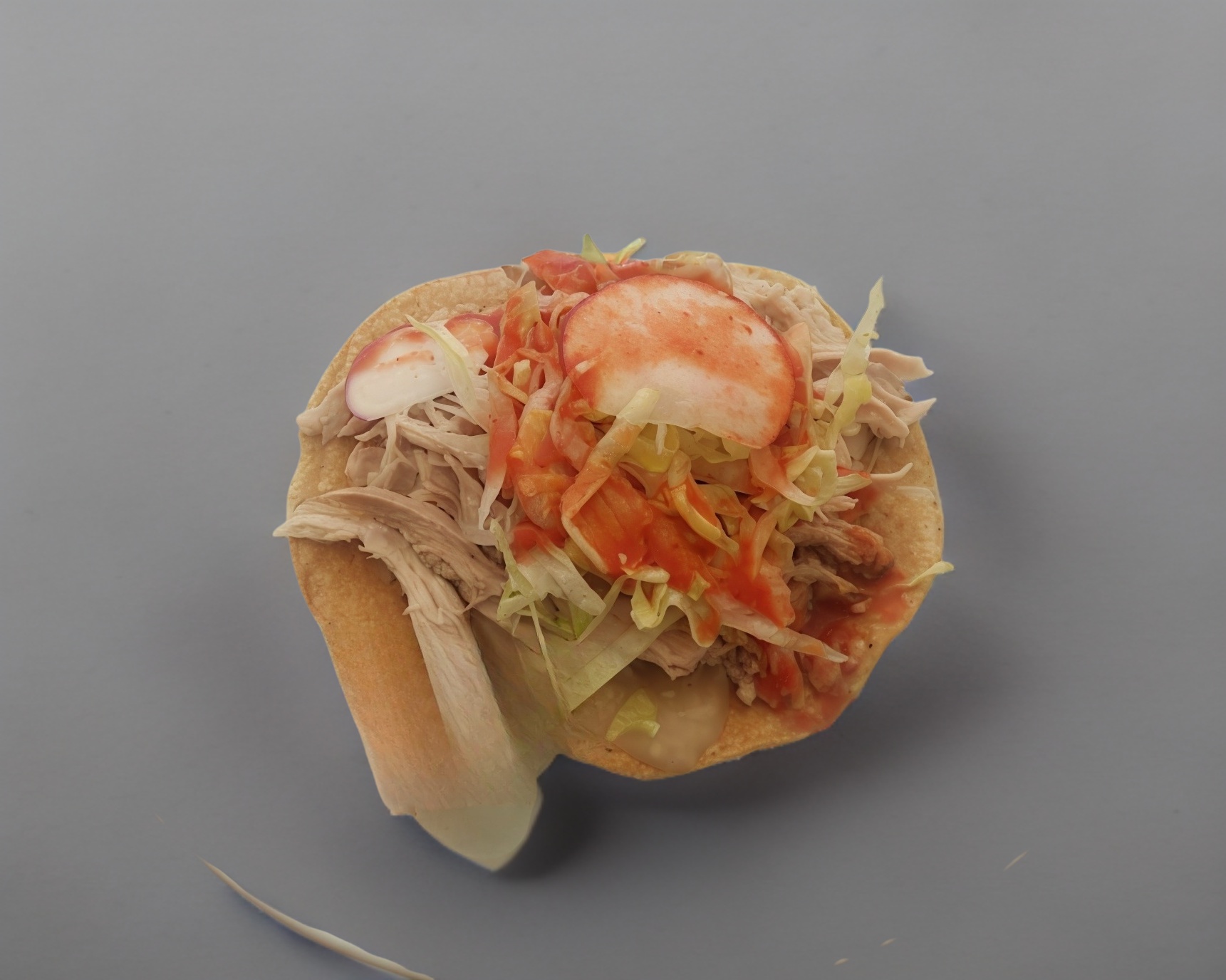 Tostada de maíz, con frijoles, pata de cerdo, acompañada de lechuga, rábano, salsa y picante