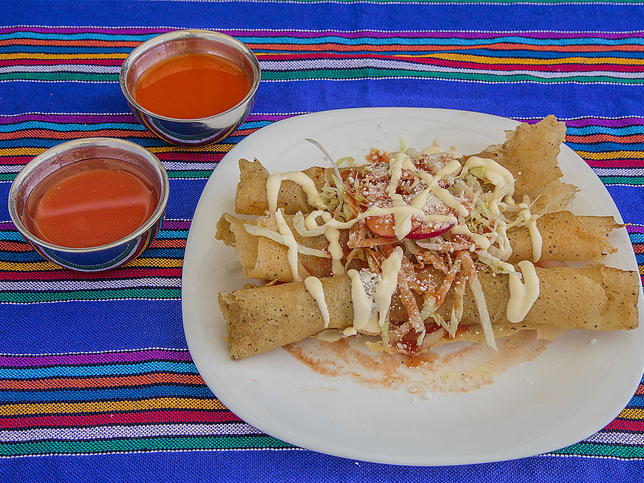 4 tacos dorados de picadillo. se sirven los complementos aparte
