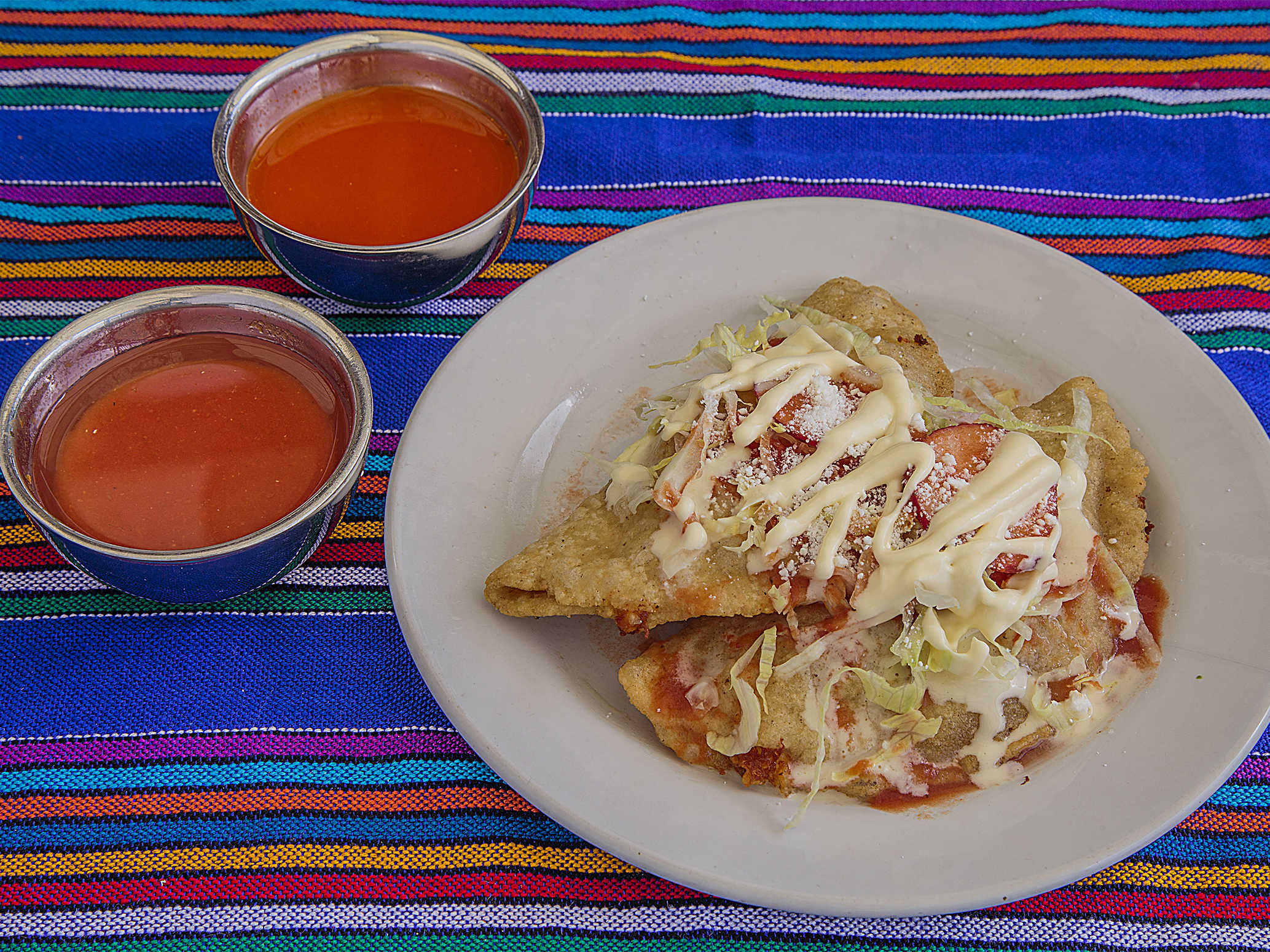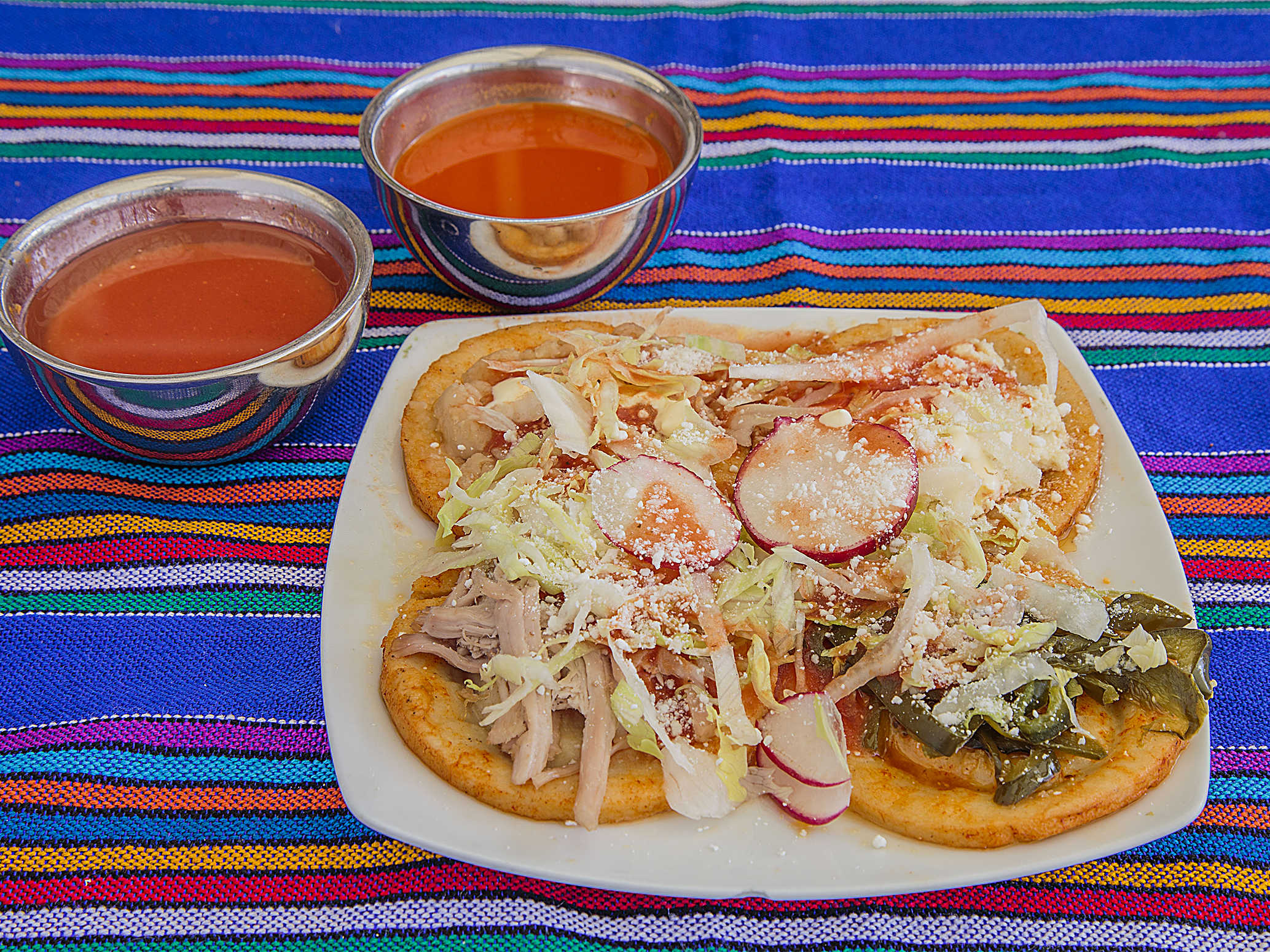 Orden de 4 piezas Papa, frijol, requeson, rajas elige la combinacion que gustes acompañado Lechuga; cebolla, Rábanos, Salsa de Jitomate chile de árbol, crema y queso cotija. Se sirve aparte