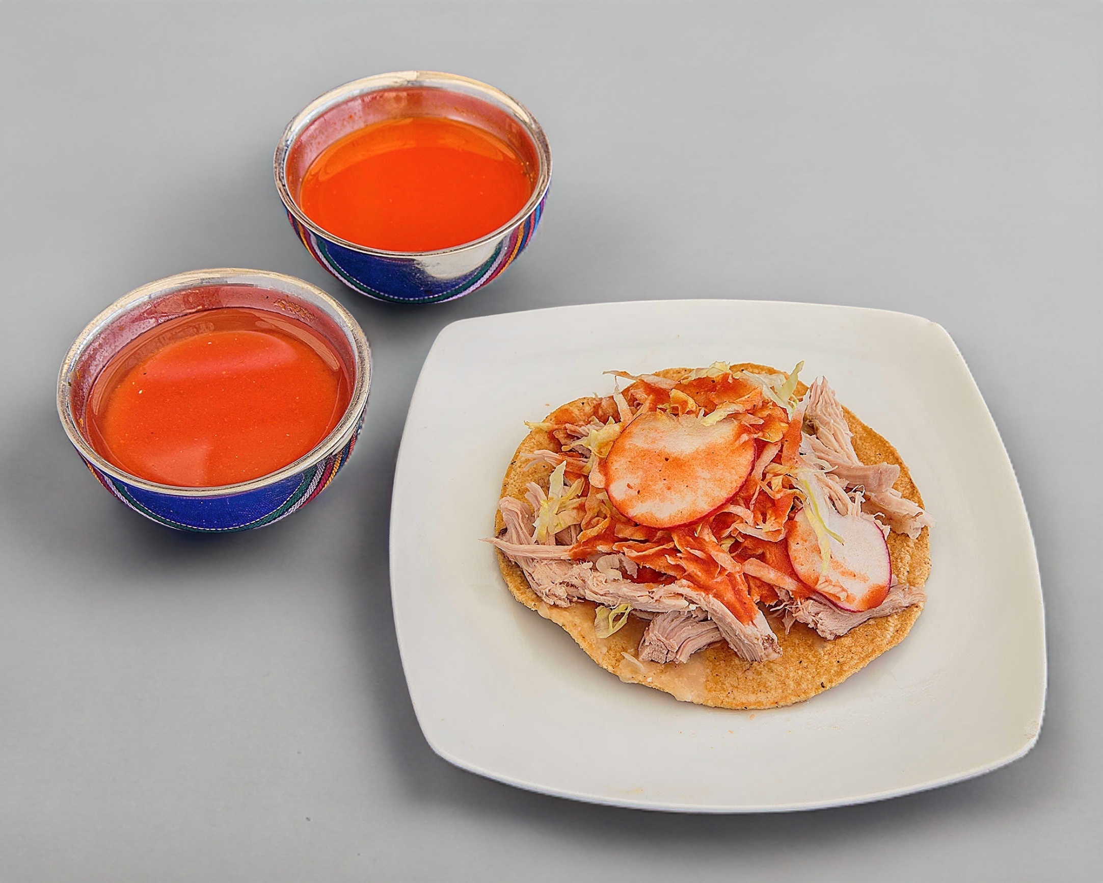 1 pza. acompañado Lechuga; cebolla, Rábanos, Salsa de Jitomate chile de árbol, crema y queso cotija. Se sirve aparte