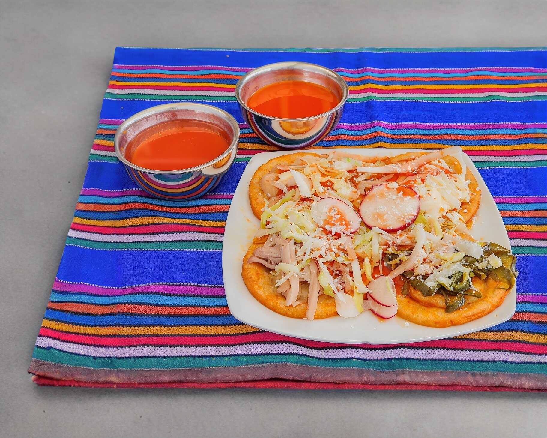Orden de 4 piezasacompañado Lechuga; cebolla, Rábanos, Salsa de Jitomate chile de árbol, crema y queso cotija. Se sirve aparte.