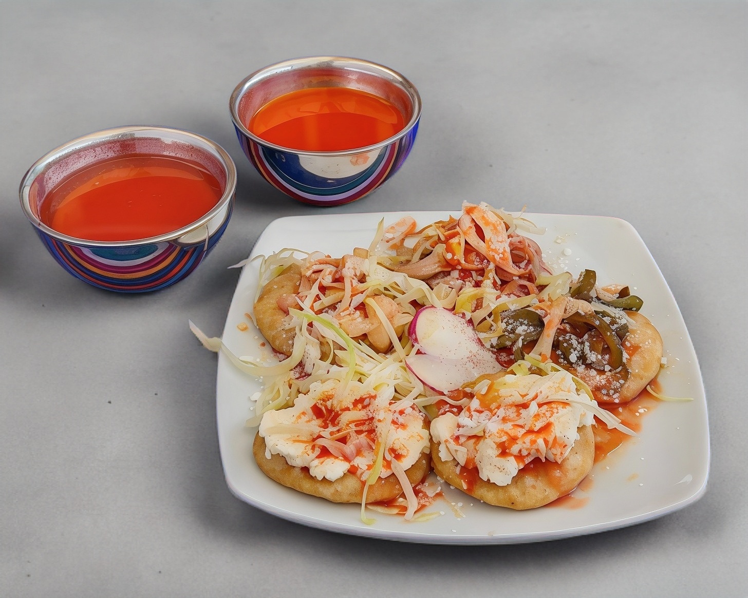 Orden de 4 piezas Cebolla y queso cotija acompañado Lechuga; cebolla, Rábanos, Salsa de Jitomate chile de árbol, crema y queso cotija. Se sirve aparte