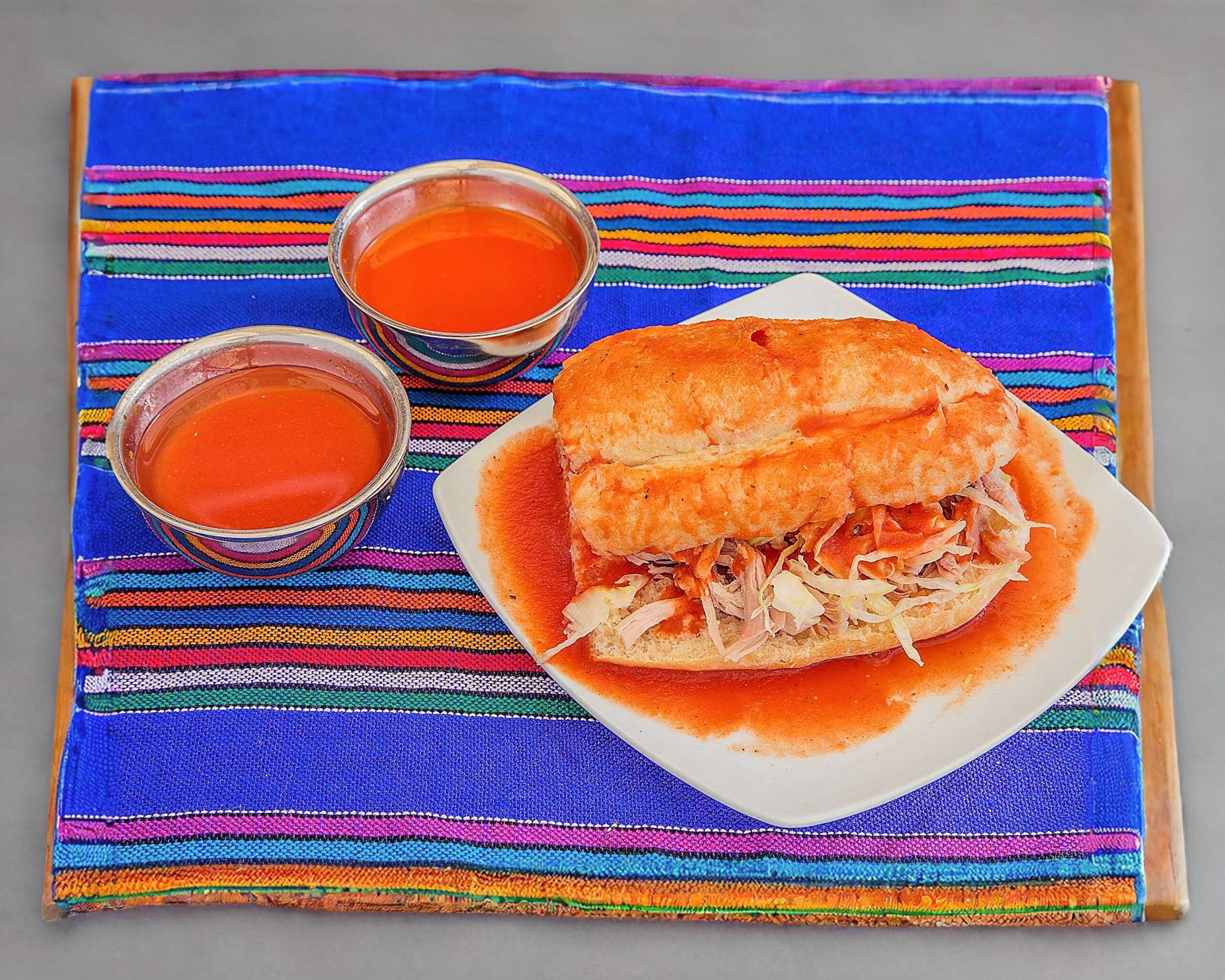 Torta de Telera con frijoles, Carne de puerdo a su eleccion, acompañada de rica salsa de La casa, lechuga, rabano, chile.