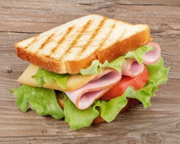 Sándwich caliente con jamón de pavo, queso gouda gratinado, cebolla, jitomate, pepino y germinado.