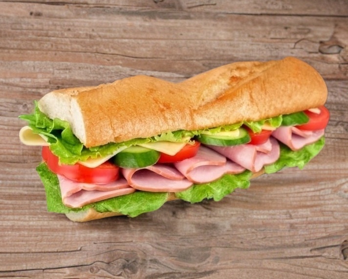 Baguette caliente con jamón de pavo, queso gouda gratinado, cebolla, jitomate, pepino y germinado.