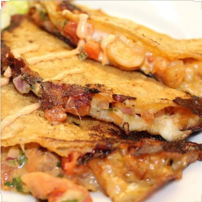 Empanada rellena de camarones y queso, acompañada de pico de gallo y con un topping de chipotle.