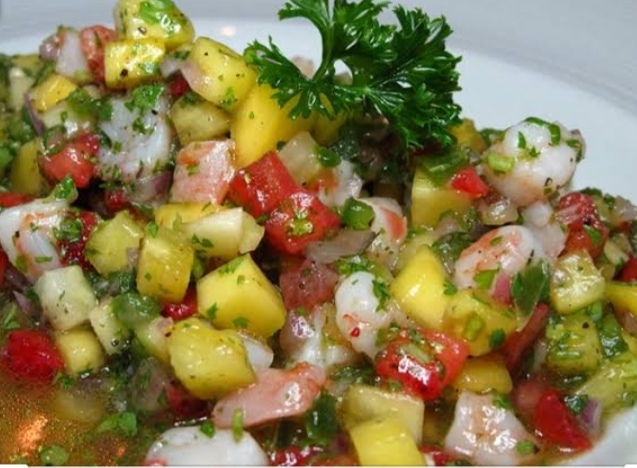 Ceviche preparado con camarón acompañado de trozos de mango o piña (según temporada), jitomate, cebolla, cilantro, y cítrico de limón. 500 gramos.