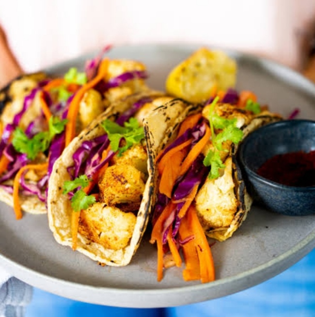 Tacos de coliflor tempura con 3 acompañamientos a elegir. Orden de 3 tacos.