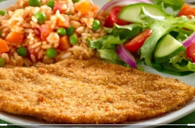 Pechuga de pollo a tu elección (asada o empanizada) acompañado de arroz blanco y ensalada.