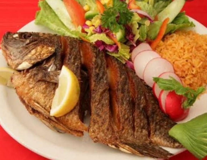 Mojarra frita acompañado de arroz blanco y ensalada fresca.