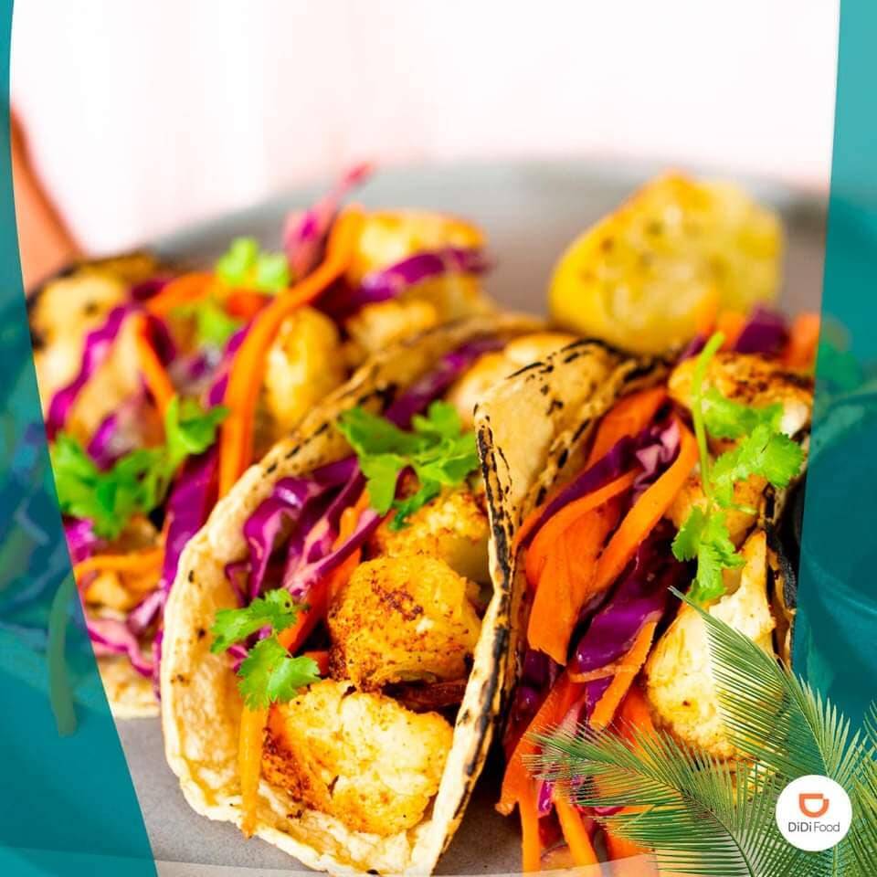 TacoS de coliflor tempura acompañado de mayonesa, aderezo al chipotle, col y salsa de aguacate. Orden de 3 tacos.