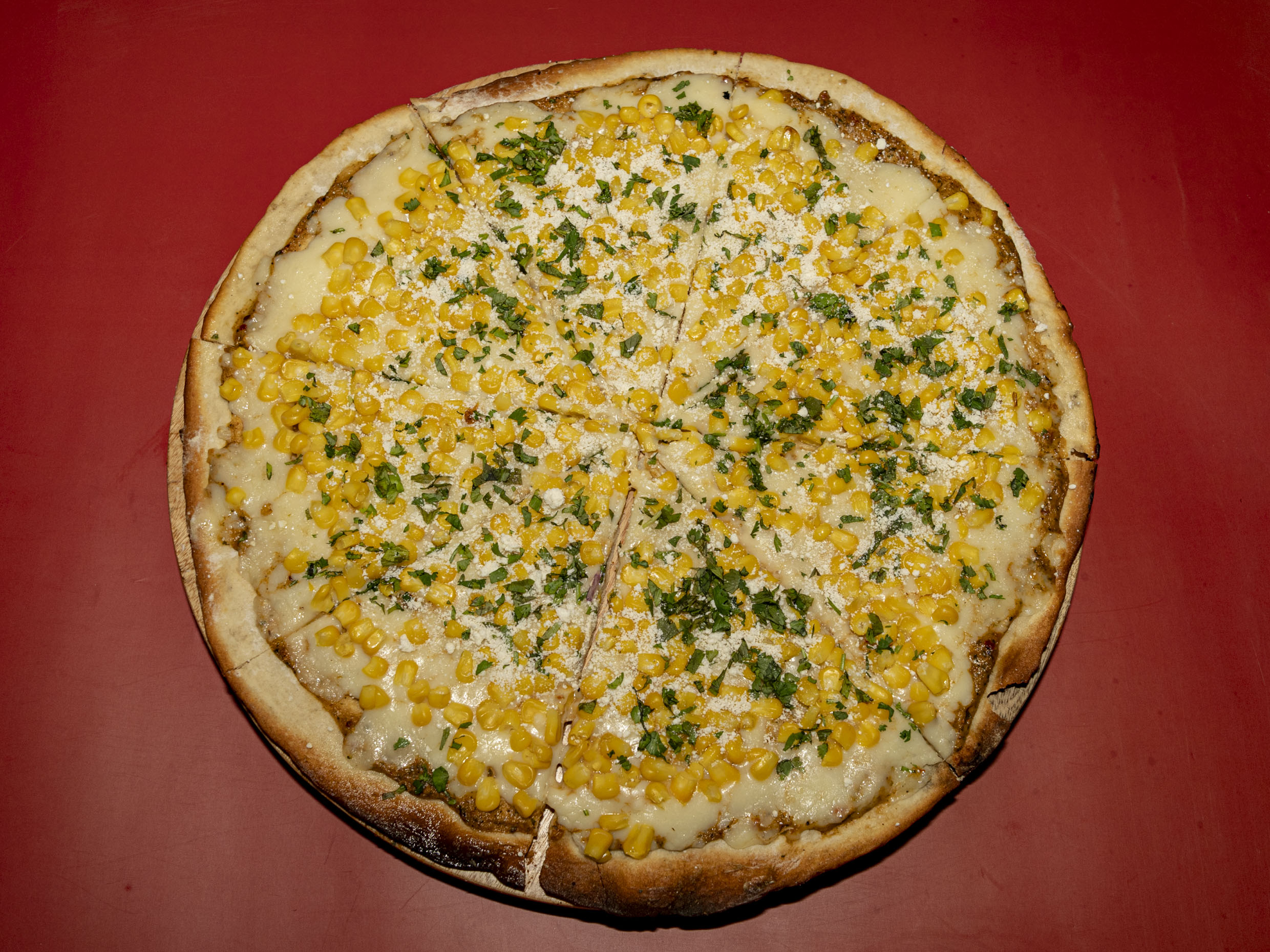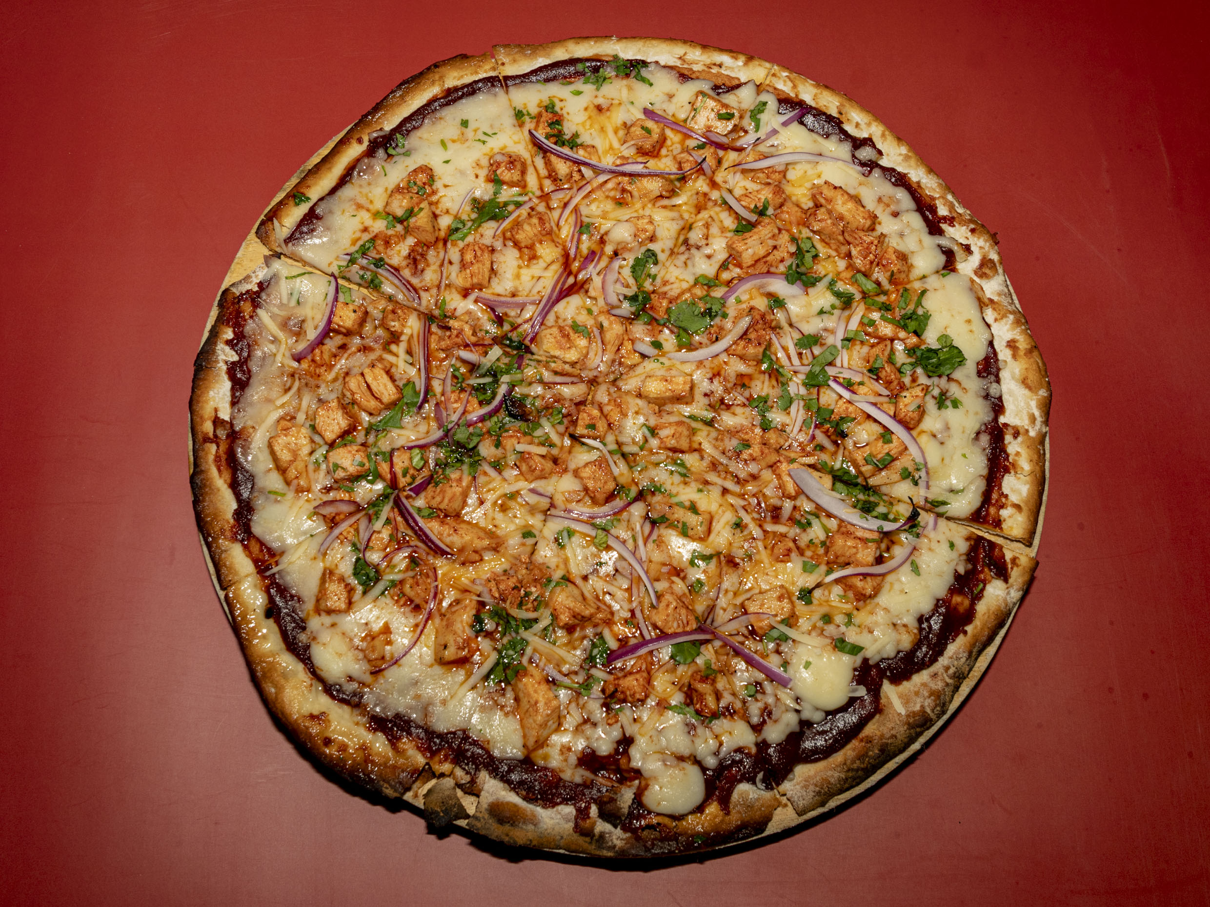 Salsa BBQ casera, pollo cajún y mucho queso, cebolla morada y cilantro fresco.