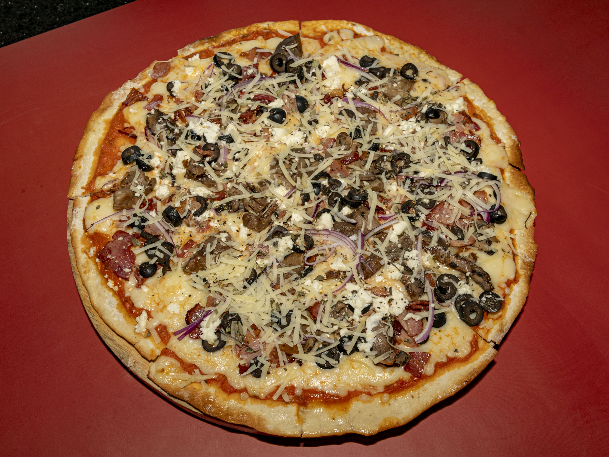 Tocino, mix de hongos, aceituna negra, cebolla morada y queso de cabra, con un toque de orégano.