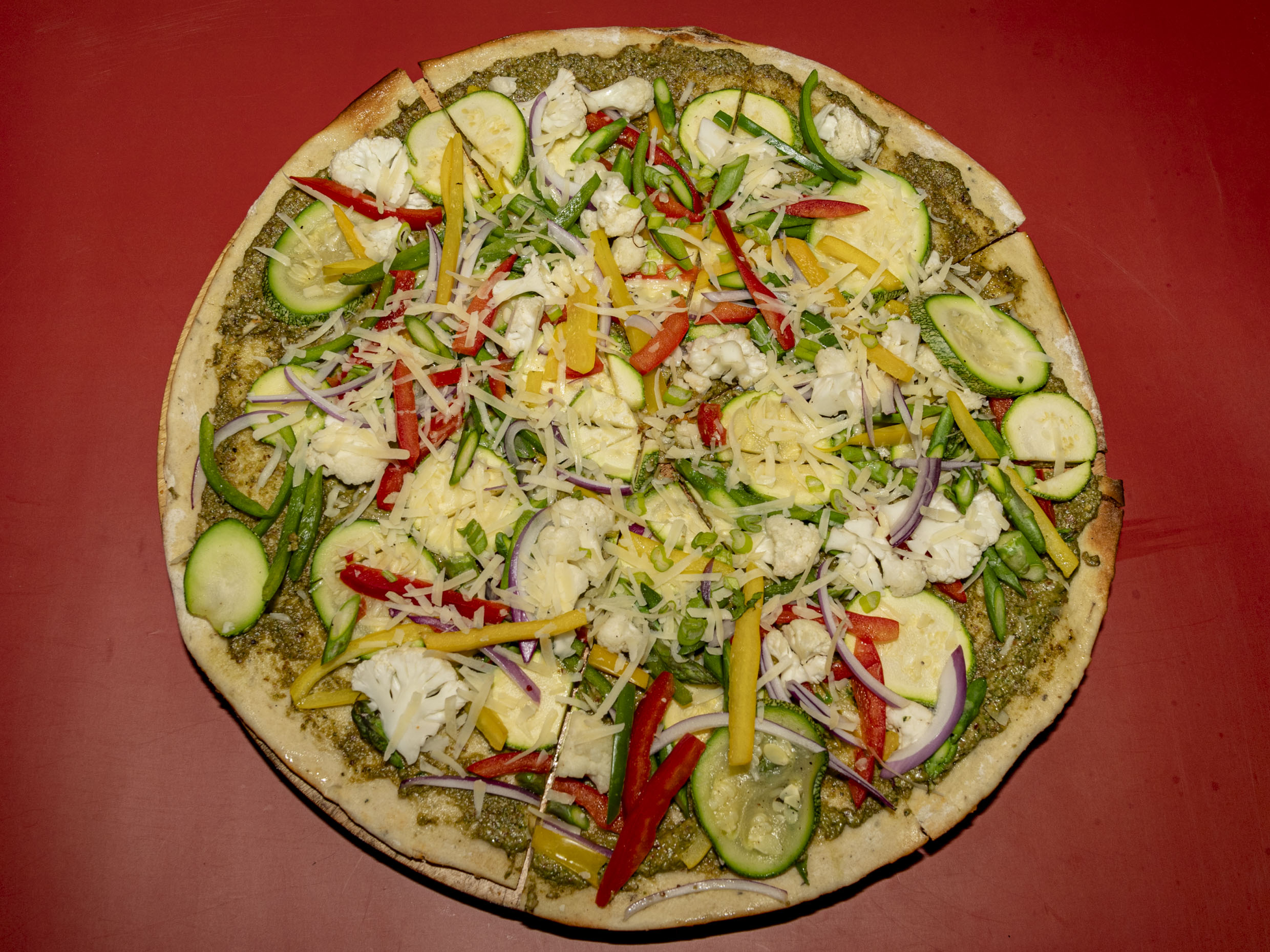 Hecha con salsa pesto, pimientos,calabacitas,coliflor, espárragos y cebolla morada con parmesano rallado