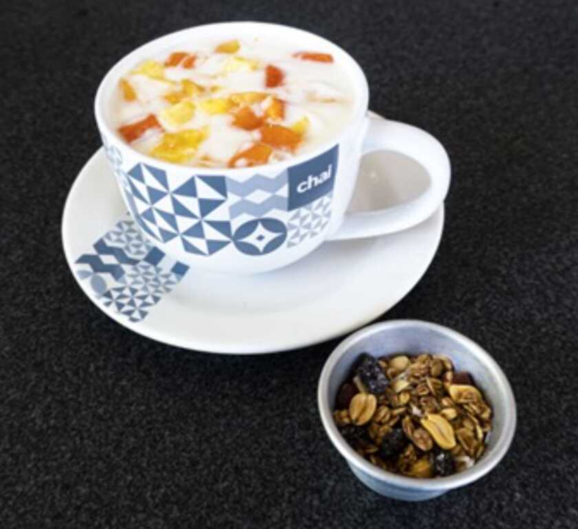 Fruta de temporada, melón, papaya, sandía y piña + cottage fresco.