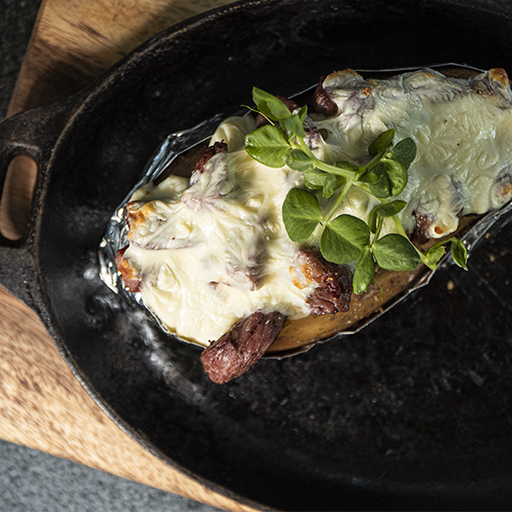 Chapata ajonjoli con 150 gramos de arrachera en rebanadas, champiñones, queso crema, mucho queso gratinado y cebolla caramelizada, acompañado con chiles toreados y salsa mexicana.