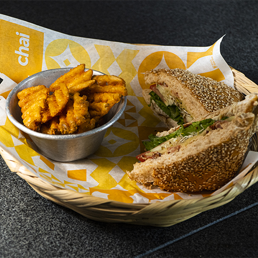 Pechuga de pollo a la parrilla con tocino y queso manchego, servido en chapata ajonjoli, lechuga, jitomate, pepino y germinado.