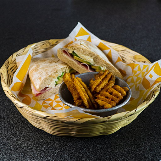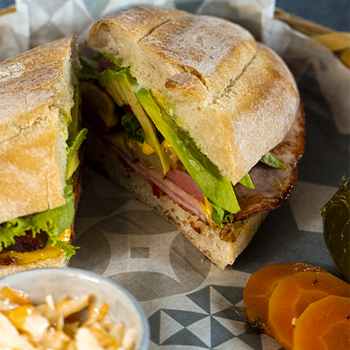 Pan chapatta rústica, pollo con aderezo de mostaza dulce, espinacas, cebolla morada, queso de cabra y aguacate.