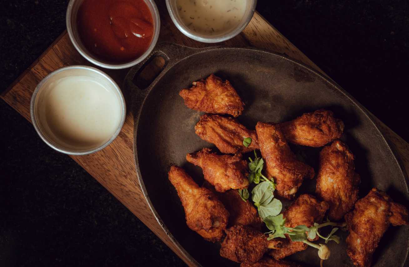 Alitas horneadas, acompañadas de salsa buffalo casera y aderezo ranch casero.