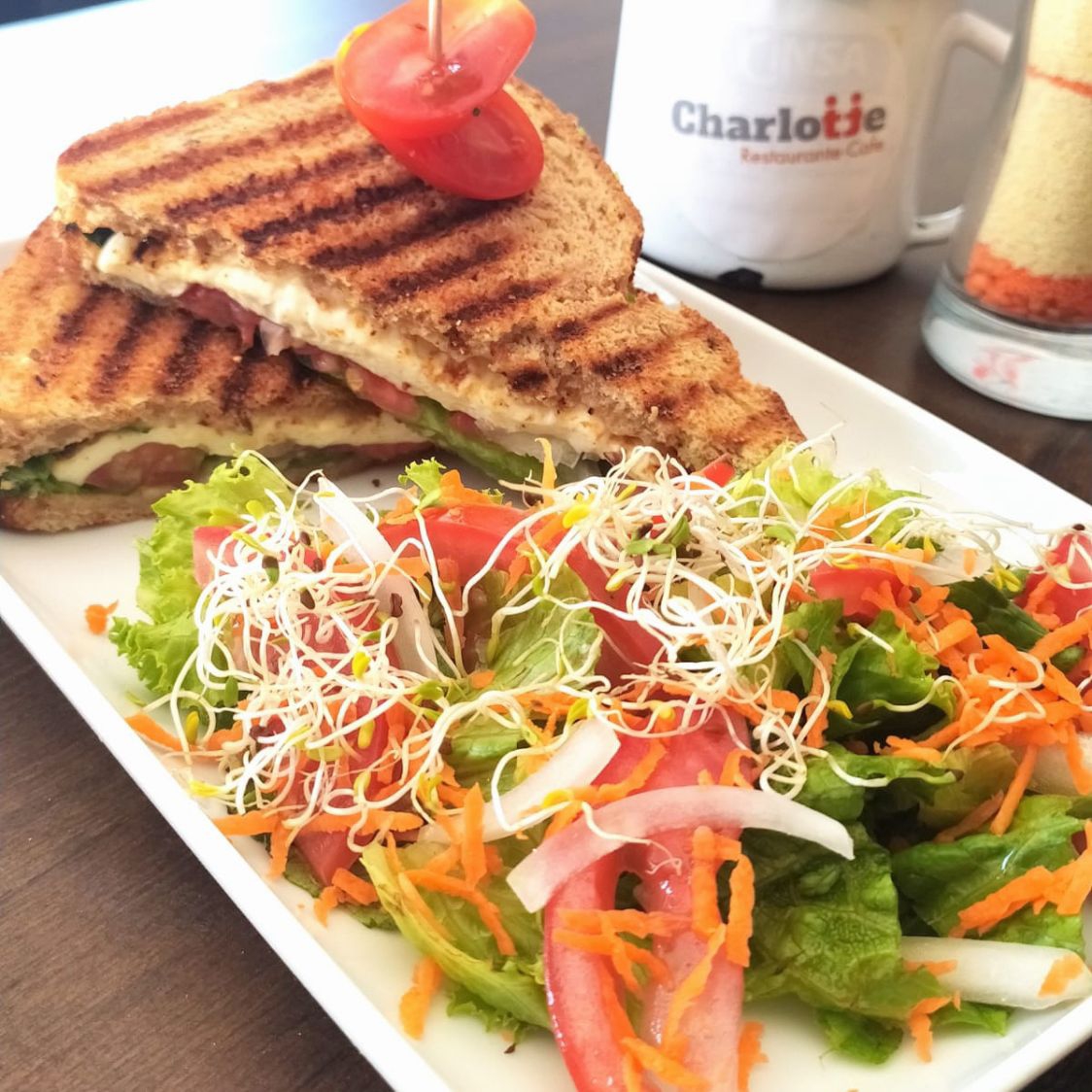 Formado por dos piezas de pan integral con cereales, combinación de vegetales salteados, germinado de alfalfa, manchego gratinado sobre una cama de espinacas y lechuga.