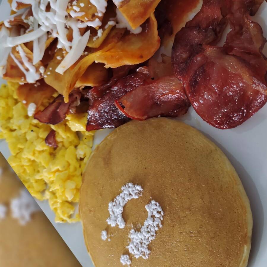 Porción de chilaquiles, un huevo, hot cake y tiras de tocino.