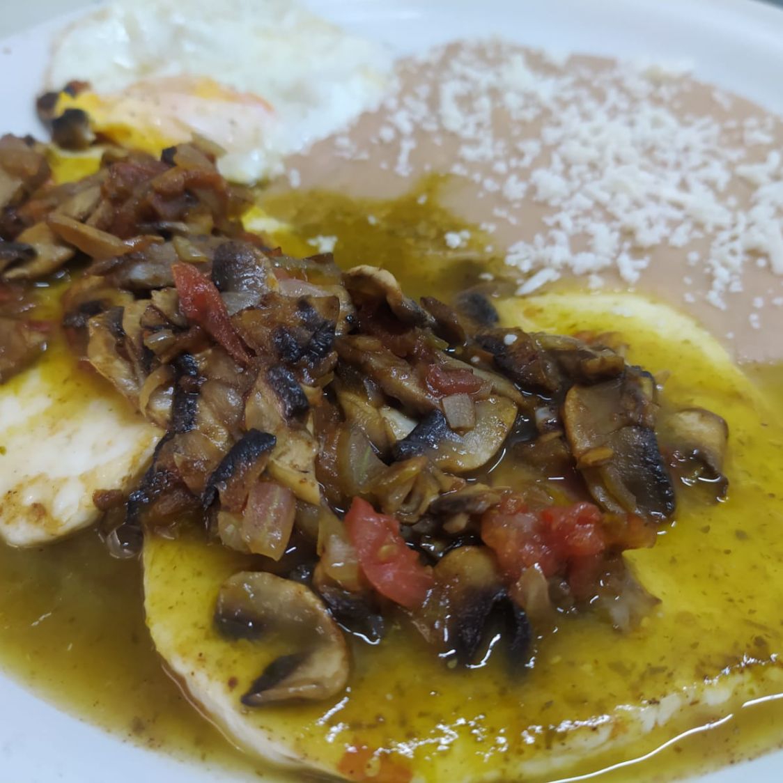 Rajas de chile poblano o champiñones guisados, sobre panela asada bañada en salsa verde acompañados de un huevo estrellado y una porción de frijoles con queso