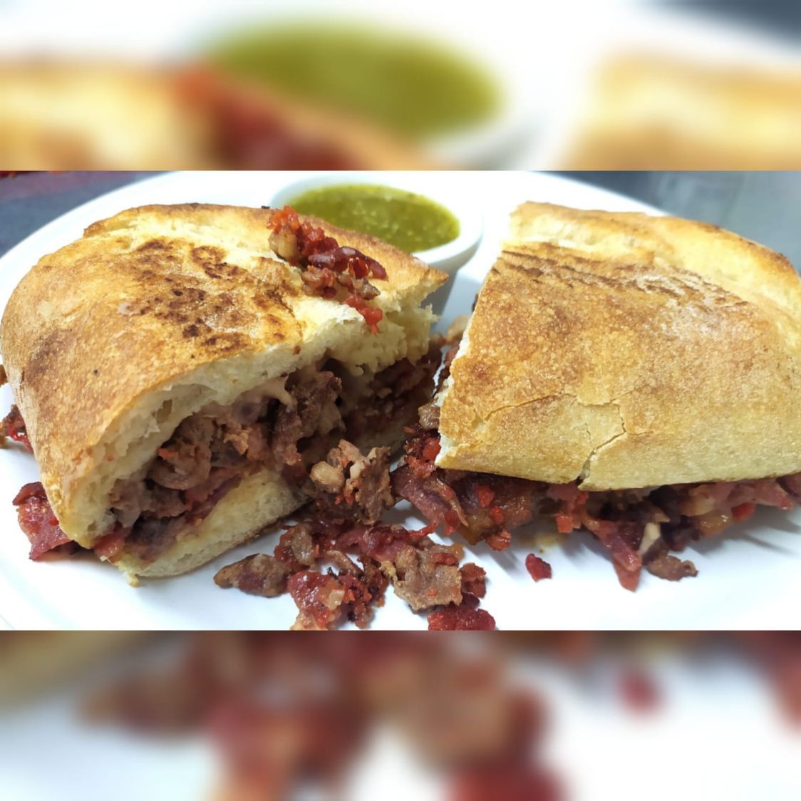 Carne adobada al pastor y gratinada, con aderezo chipotle y piña en almíbar