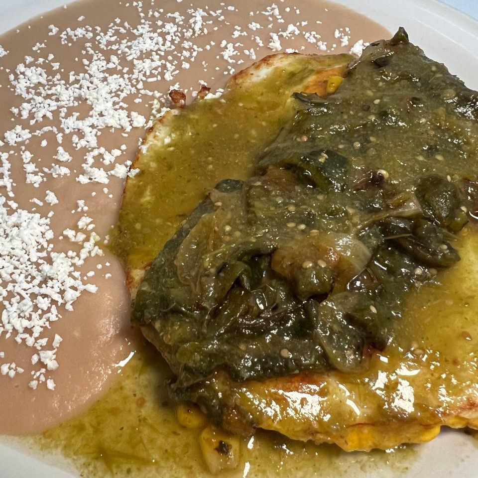 Rajas de chile poblano en salsa verde sobre dos huevos estrellados con una tortilla sofrita de base y guarnición de frijoles.
