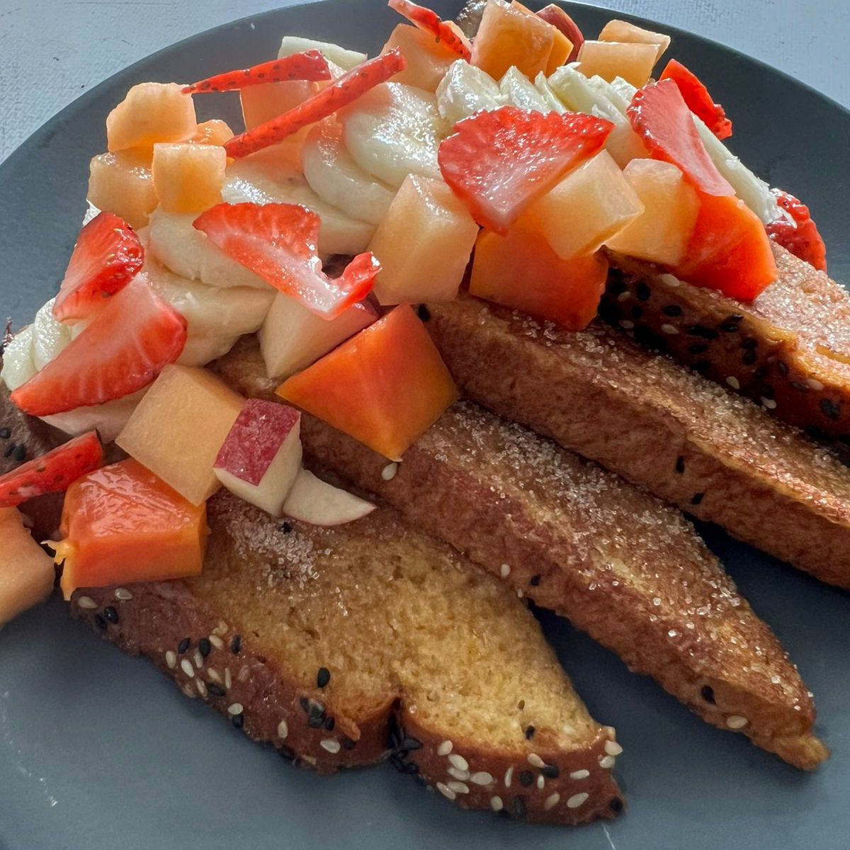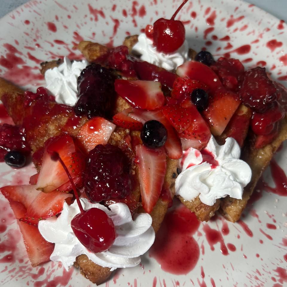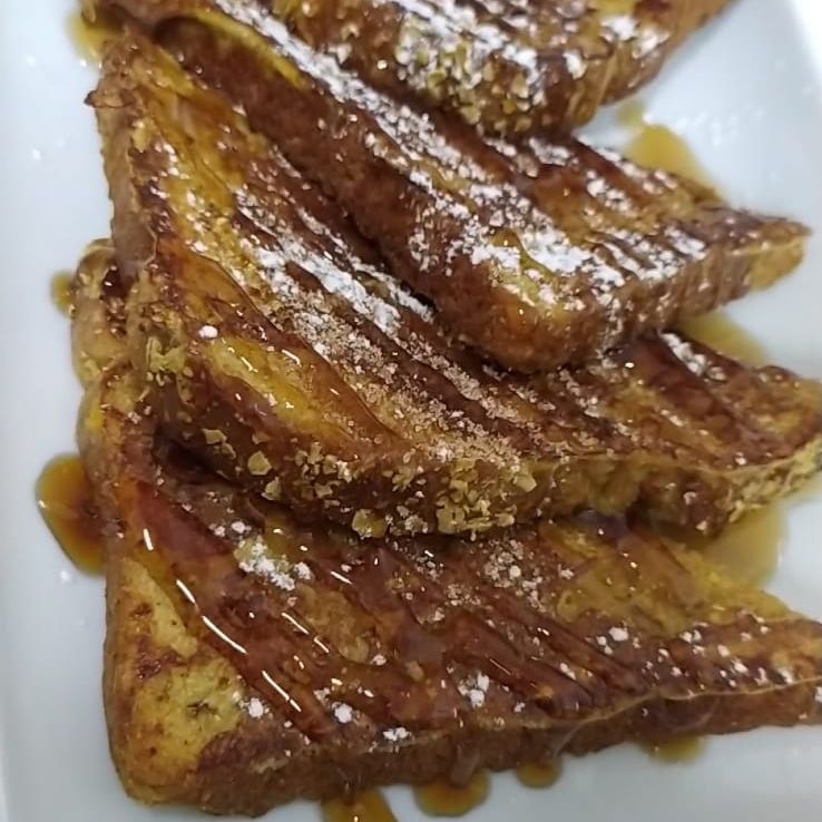 Dos piezas de pan integral artesanal en la mezcla de la casa. Espolvoreado con canela, un toque de miel maple, crema batida y trocitos de nuez.