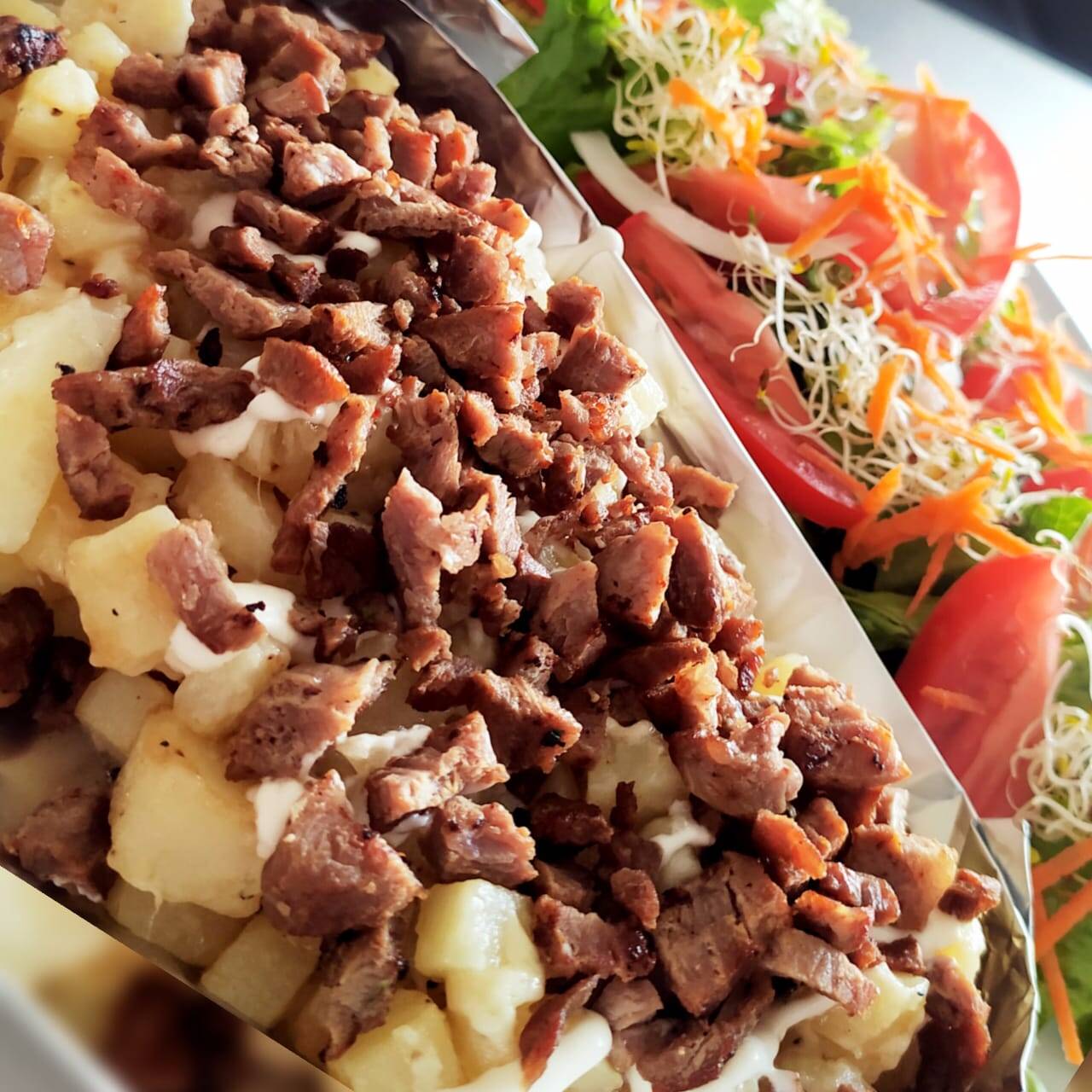 Carne de res, peperoni con nuestra salsa pomodoro, queso gouda y vegetales acompañada de papas a la francesa