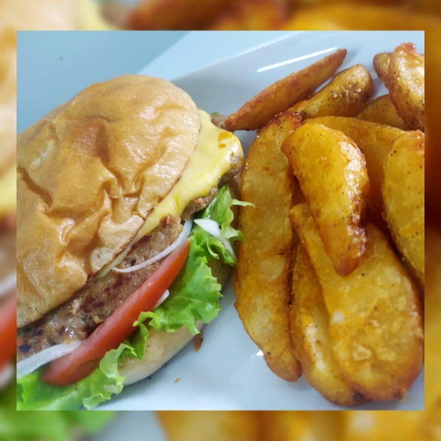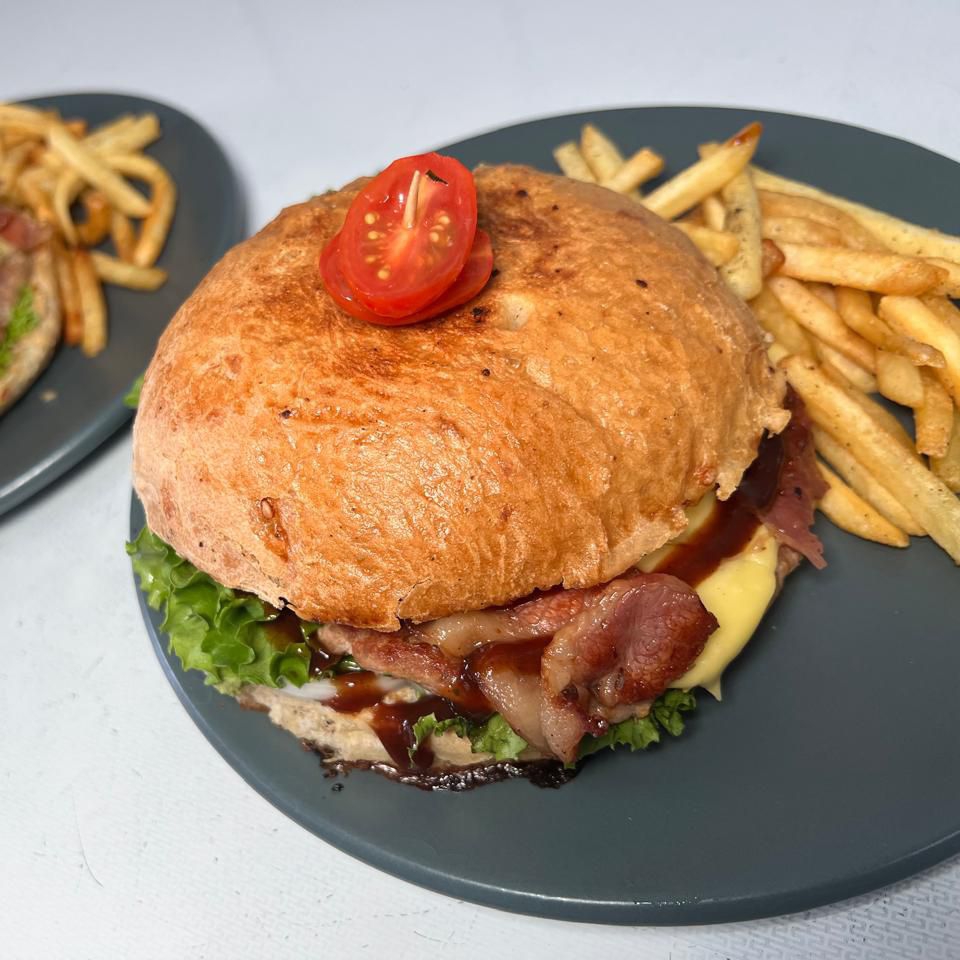 Carne jugosa de res, piña asada con un toque de salsa BBQ , jamón y queso gouda, con base de vegetales acompañada de papas a la francesa