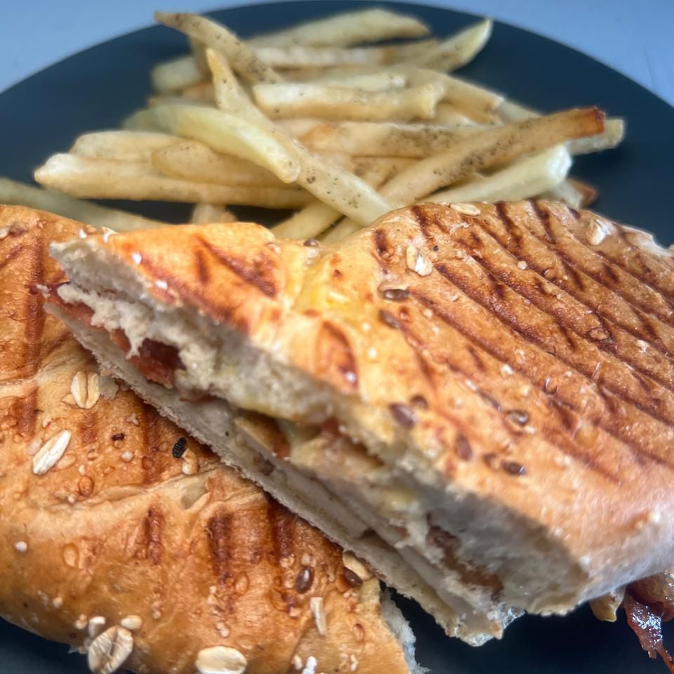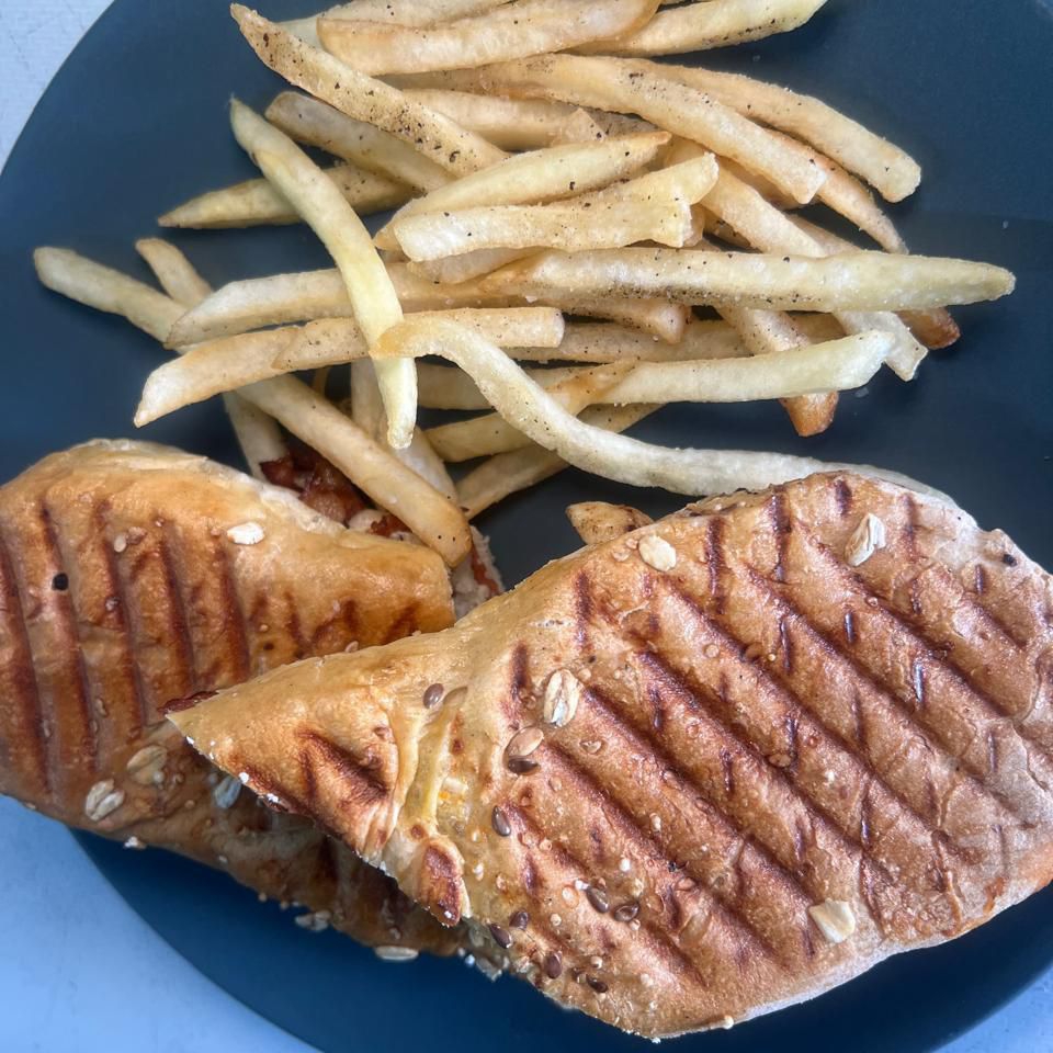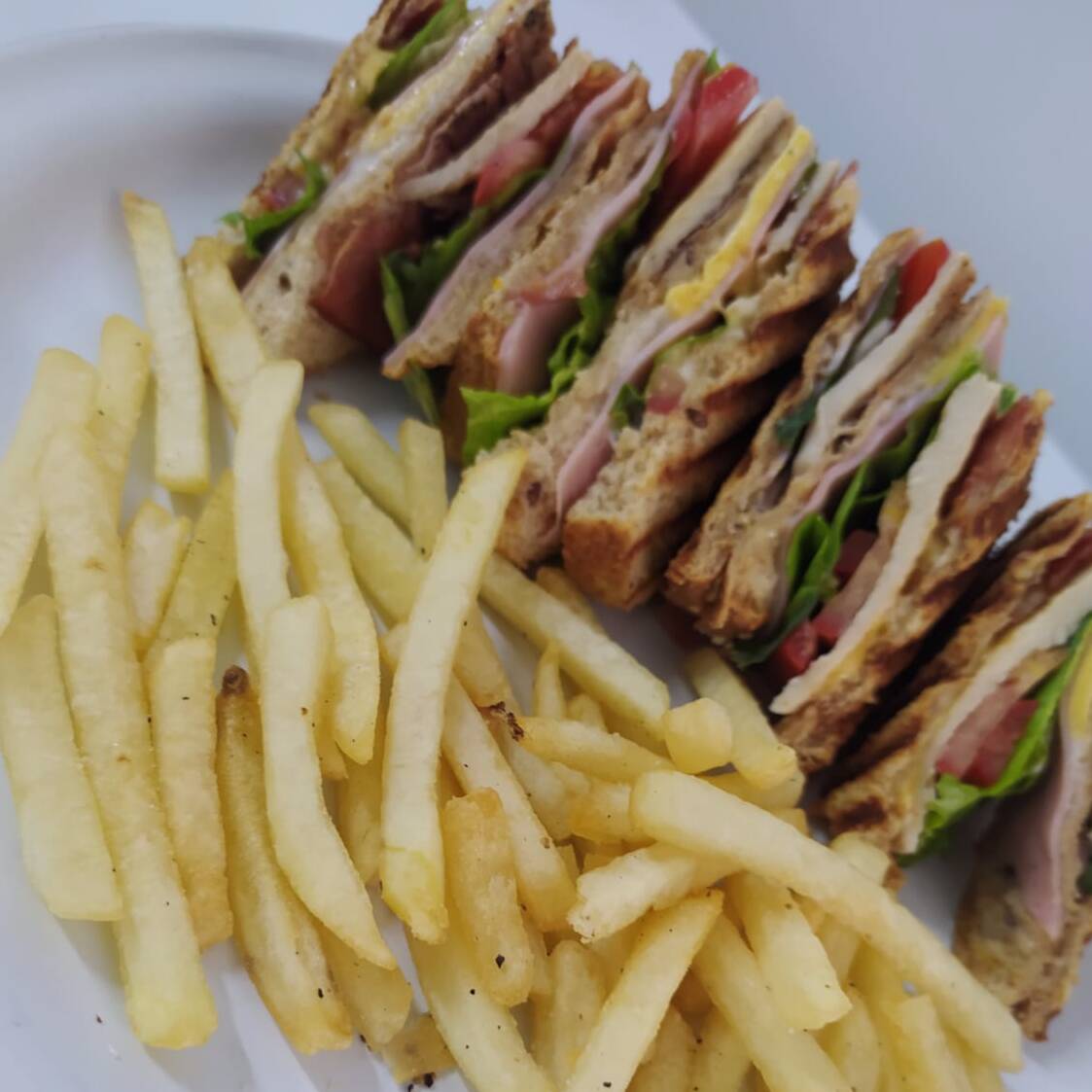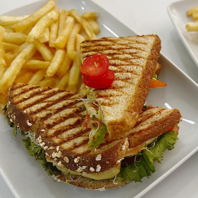 Formado por 3 piezas de pan integral con cereales, filete de pollo a la plancha, tocino, lechuga, jamón, cebolla, jitomate, y queso gouda con guarnición de papas a la francesa.