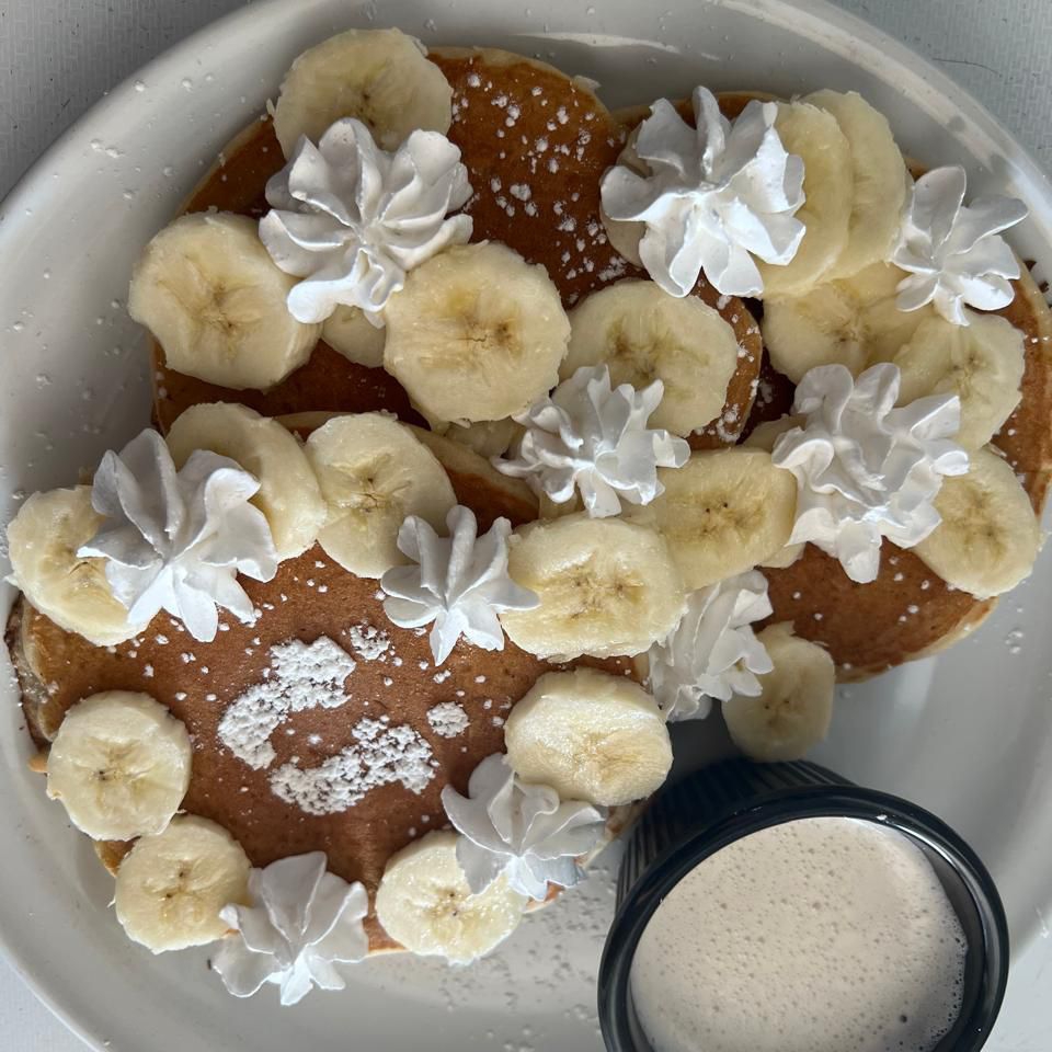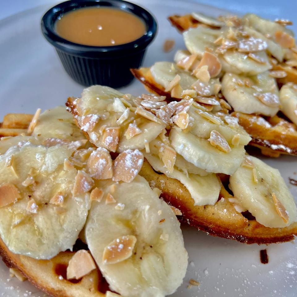 Dos piezas de pan integral artesanal en la mezcla de la casa. Con un sutil sabor a café, acompañado de helado de vainilla, plátano, almendra fileteada y un toque de chocolate liquido.