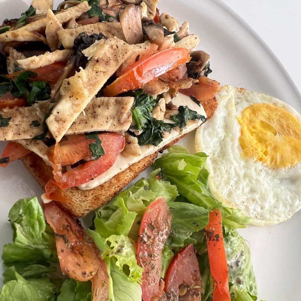 Panela asada, champiñon, espinacas y jitomate guisados, trocitos de pollo a la plancha sobre una tapa de pan ligeramente tostado y acompañado de lechuga con jitomate asado a las finas hierbas y un huevo