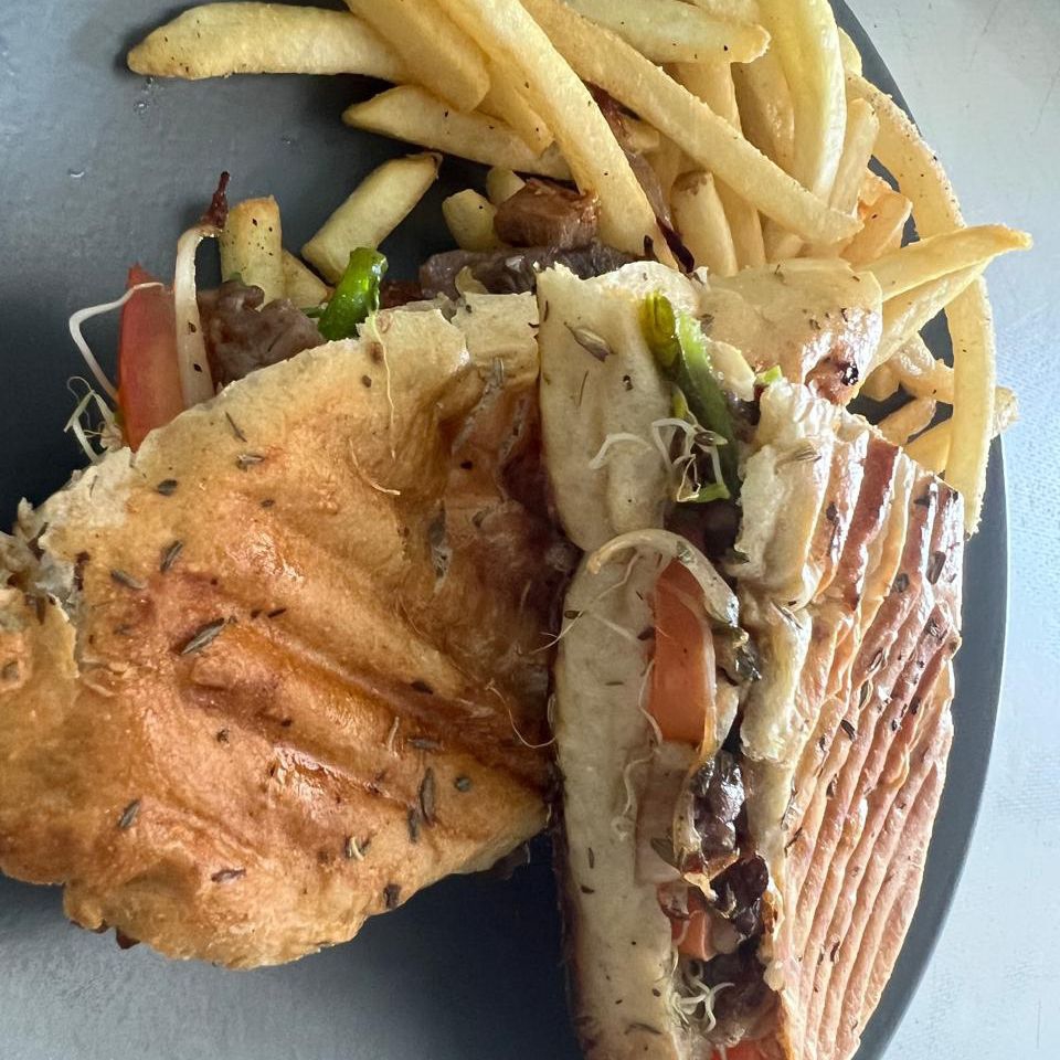 Carne de res, sazonada y gratinada con queso gouda, vegetales y aderezo de mayonesa acompañada de papas a la francesa