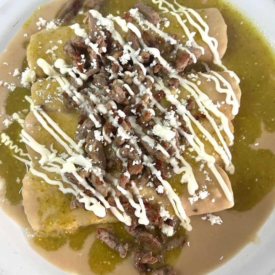Enfrijoladas con arrachera rellenas de queso Oaxaca, con un toque de salsa verde, queso y crema