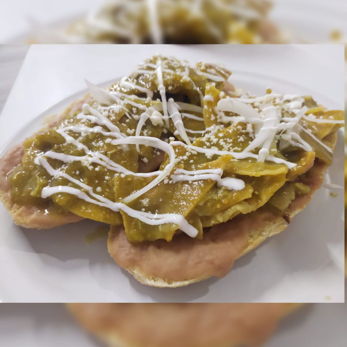 Base de frijoles fritos y chilaquiles con queso crema y cebolla.