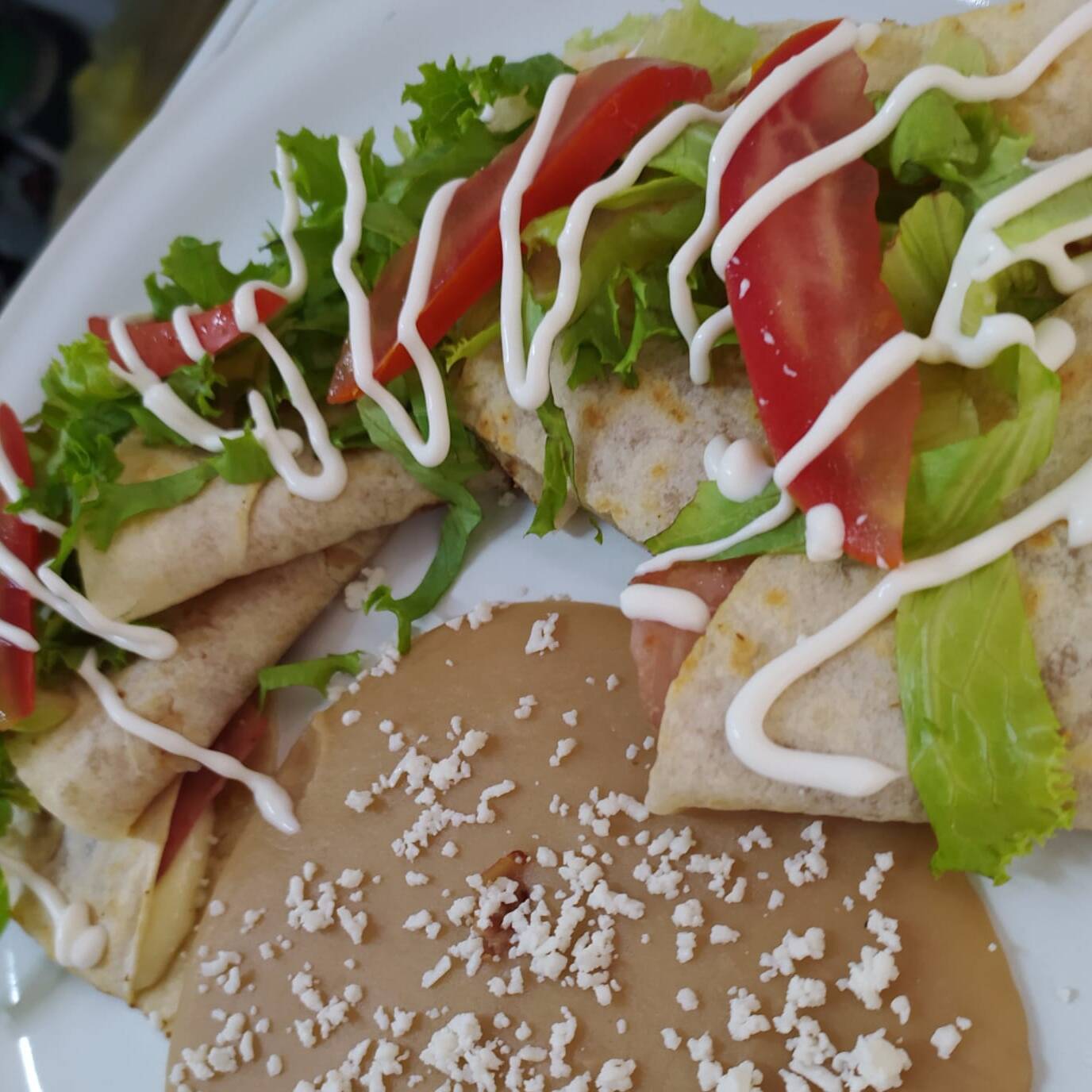 Orden de tres piezas con queso y crema, acompañadas de lechuga y jitomate con guarnición de frijoles.