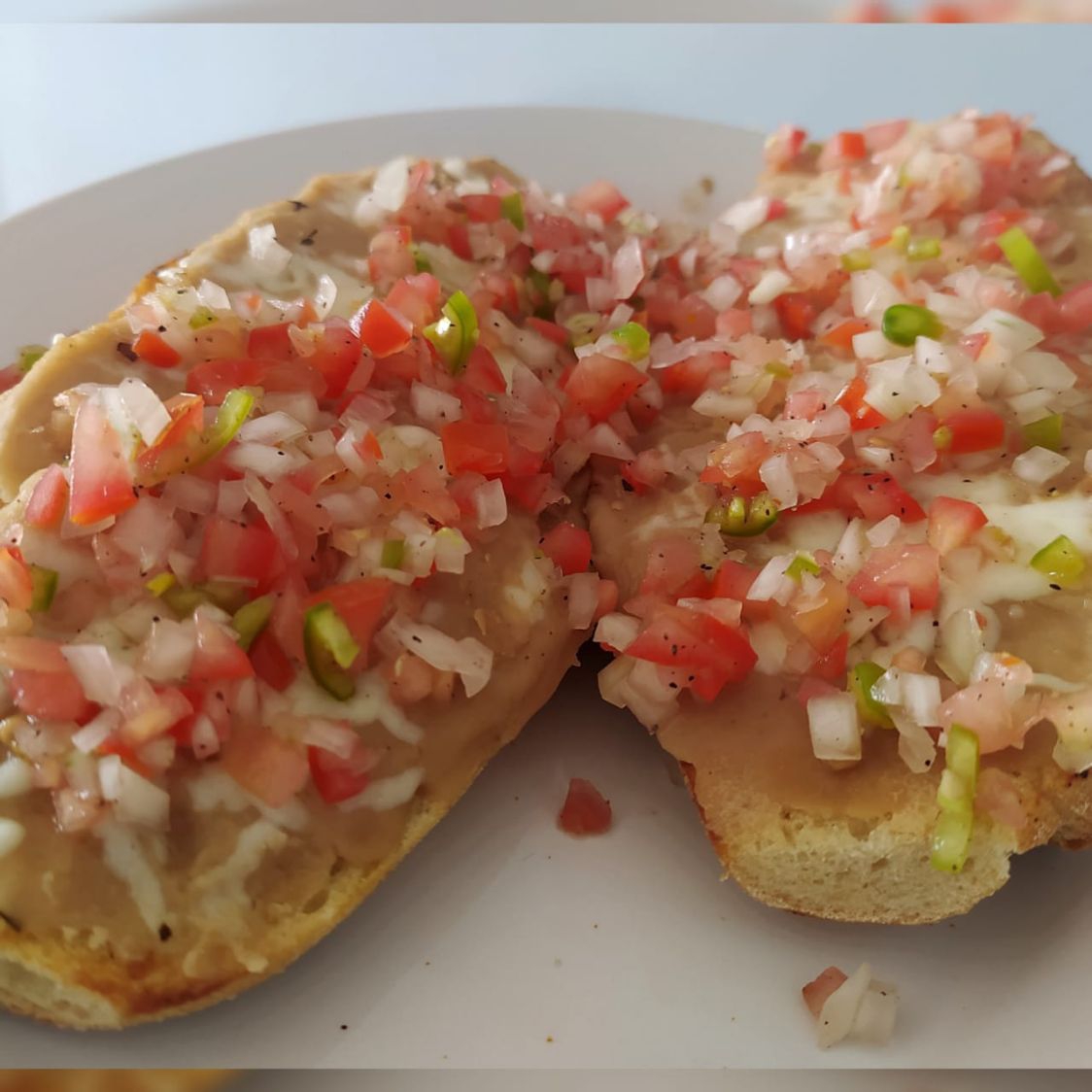 Base de frijoles fritos gratinados y salsa mexicana.