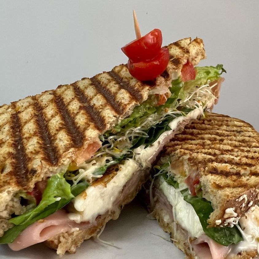 Formado por dos piezas de pan integral con cereales, panela asada con finas hierbas, germinado, jitomate, cebolla, espinaca, lechuga.