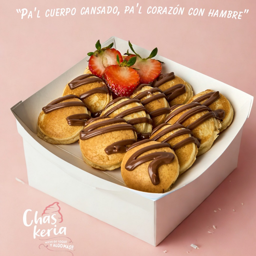 12pzs. De ricos y esponjosos mini Hotcakes bañados de crema dulce de la casa acompañados de 50gr. De fresa, 60gr. De plátano y mini kiss